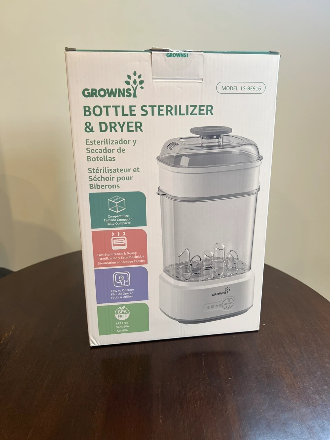 This Grownsy bottle sterilizer and dryer efficiently sanitizes and dries baby bottles. It's BPA-free and has a compact size. Fast sterilization and drying capabilities get bottles ready quickly!