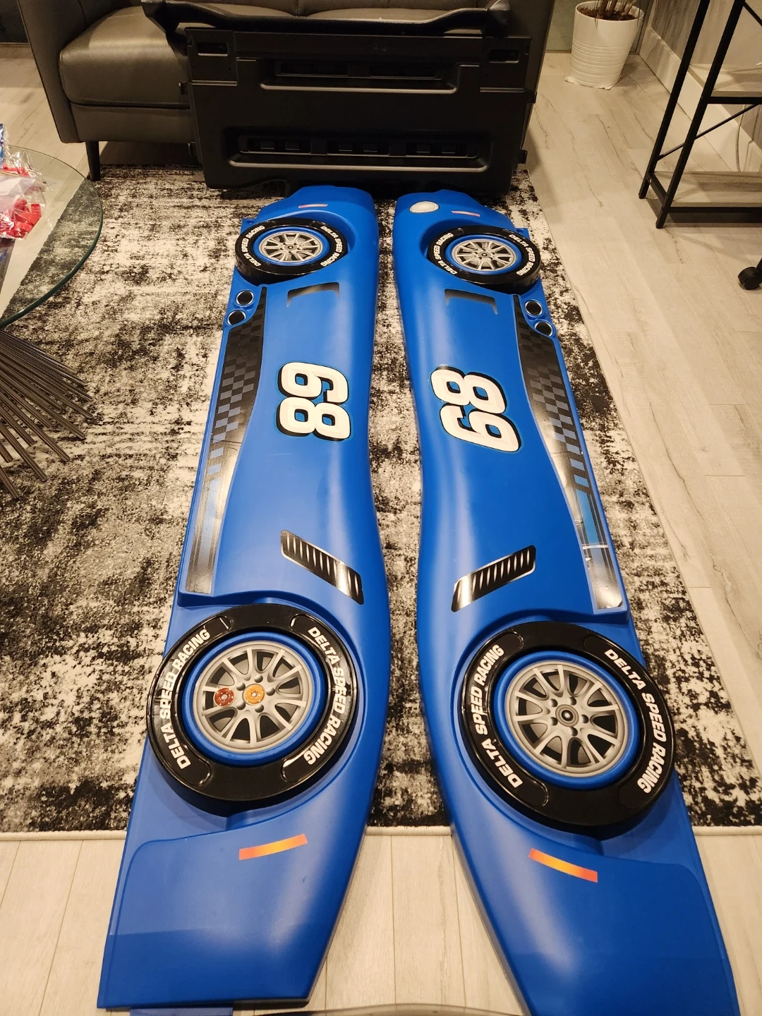 This is a used Racing car bed frame, perfect for any young race car enthusiast! It's made of durable plastic and designed to look like a cool race car. The bed frame includes the headboard and side rails for safety.