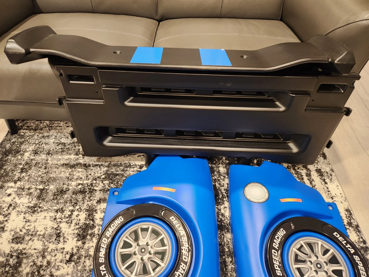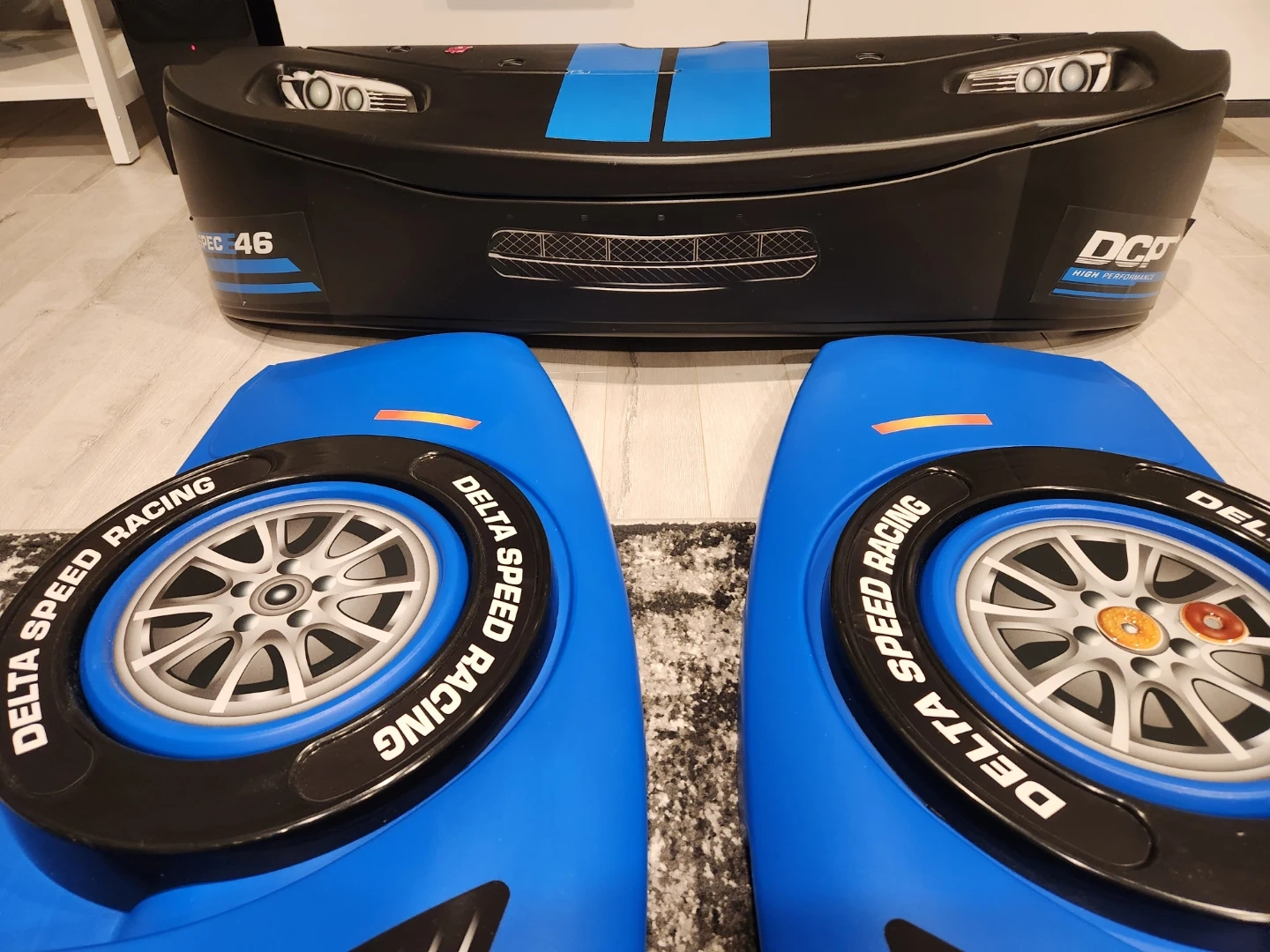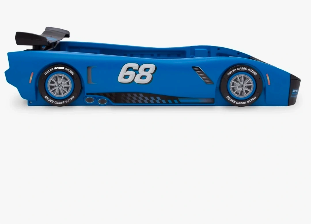 This is a used Racing car bed frame, perfect for any young race car enthusiast! It's made of durable plastic and designed to look like a cool race car. The bed frame includes the headboard and side rails for safety.