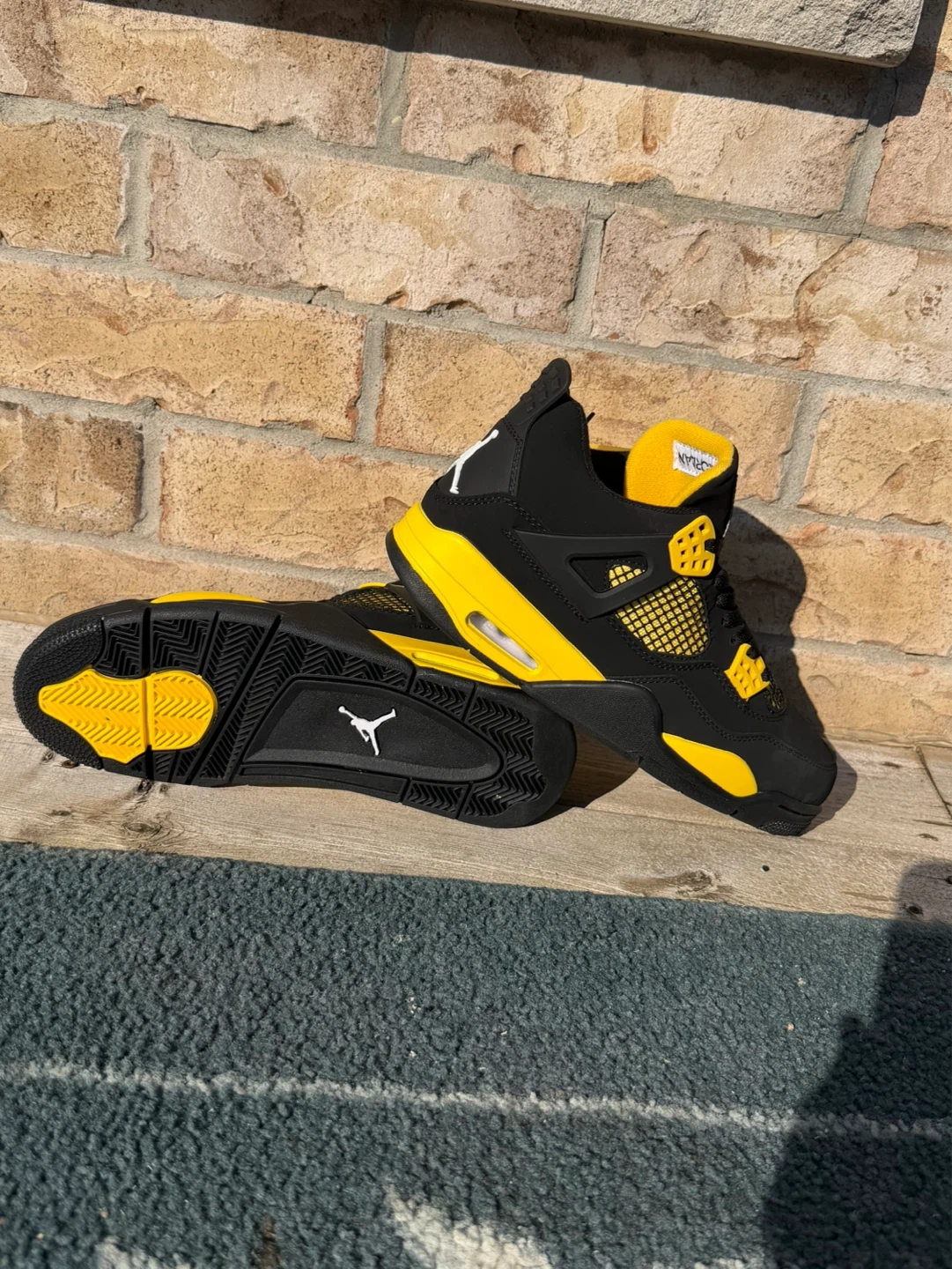 Pair of Jordan 4 Retro sneakers in black and yellow. Features the iconic Jumpman logo. Textile and synthetic materials.