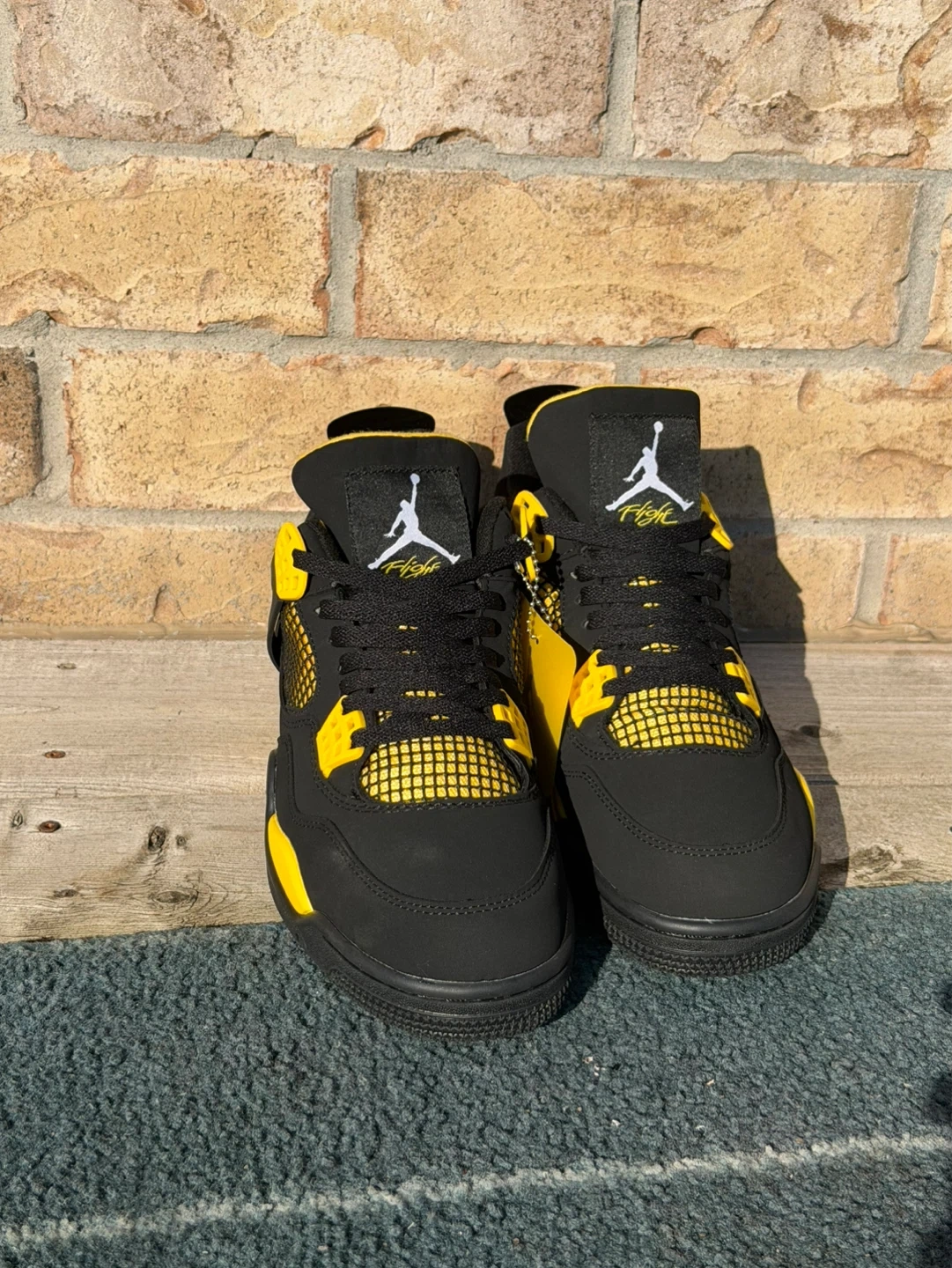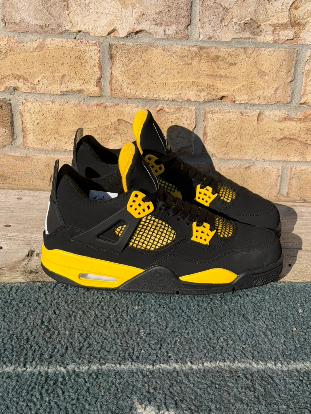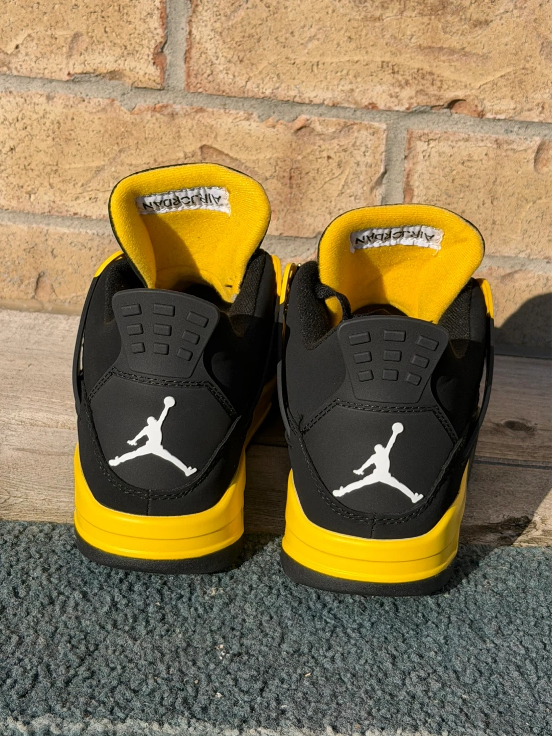 Pair of Jordan 4 Retro sneakers in black and yellow. Features the iconic Jumpman logo. Textile and synthetic materials.
