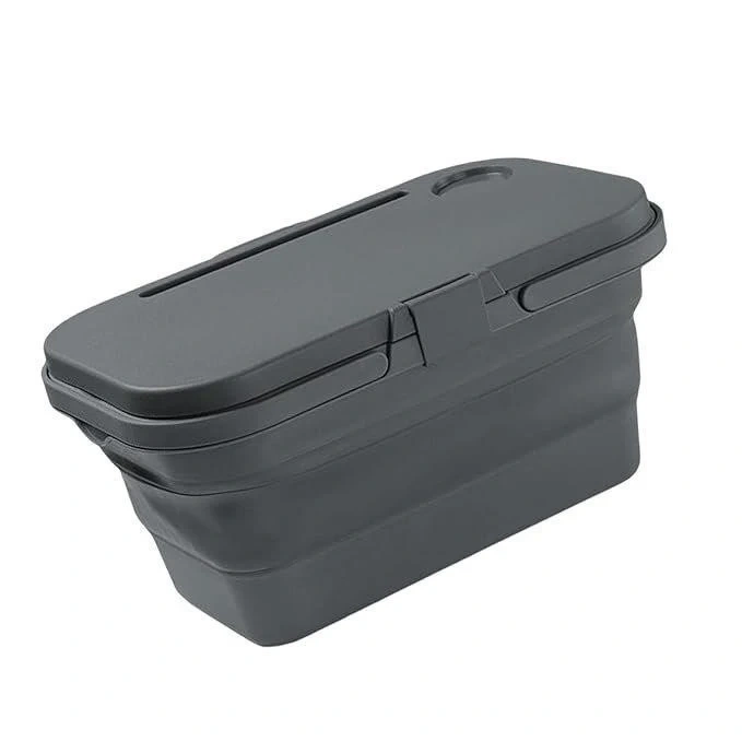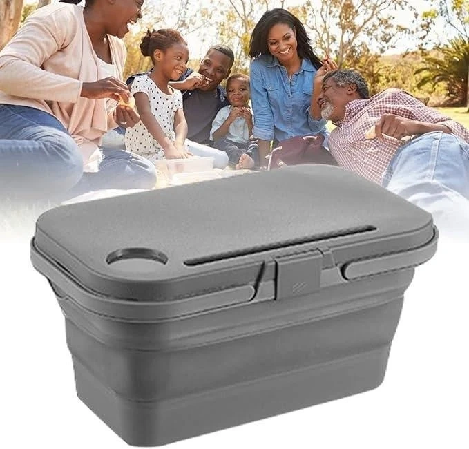 This grey collapsible picnic table is great for outdoor use. It's made of durable plastic and folds down for easy storage. The table features a cup holder and a slot for a phone or tablet. It's perfect for picnics, camping, or backyard gatherings!