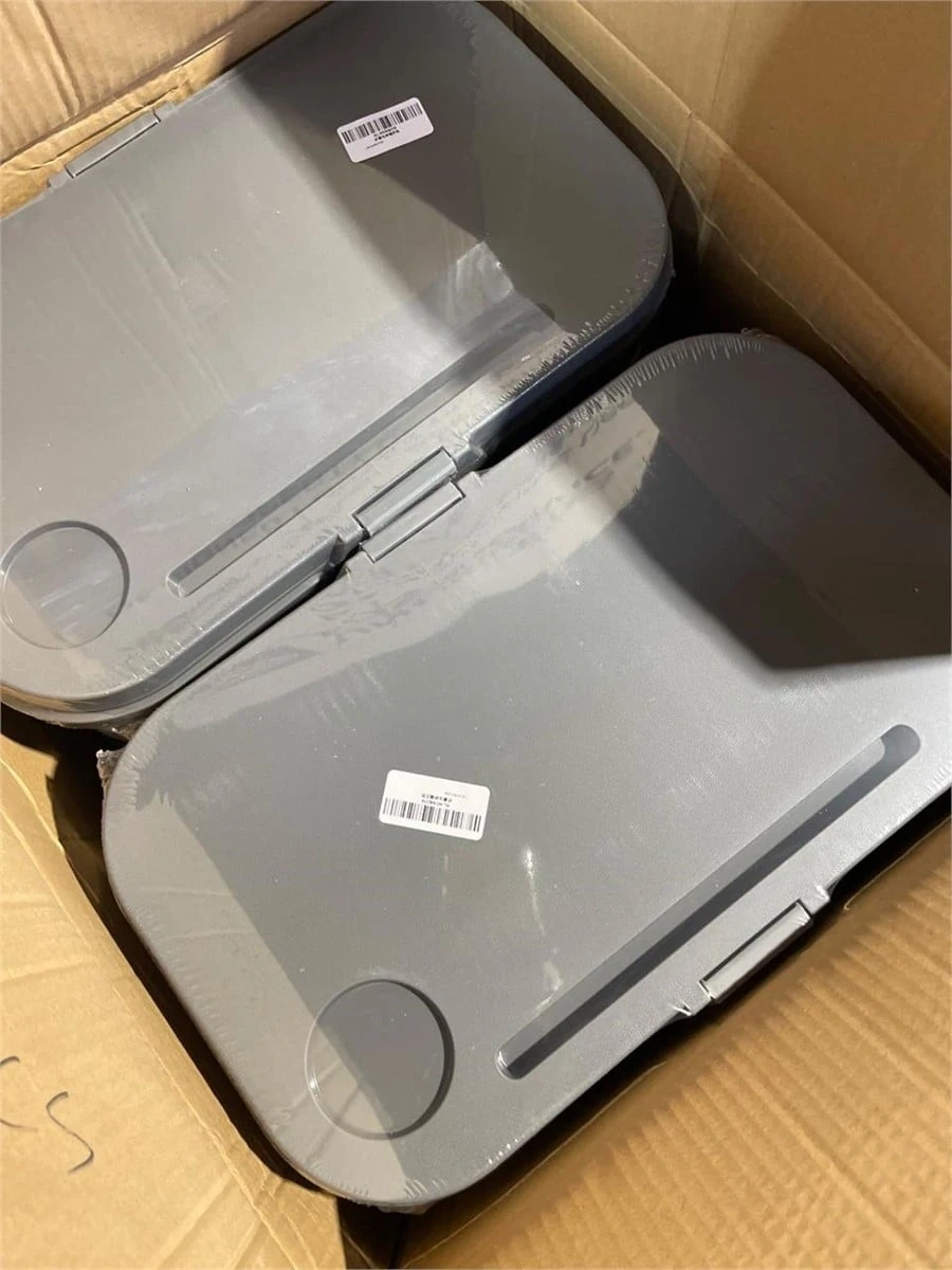 This grey collapsible picnic table is great for outdoor use. It's made of durable plastic and folds down for easy storage. The table features a cup holder and a slot for a phone or tablet. It's perfect for picnics, camping, or backyard gatherings!