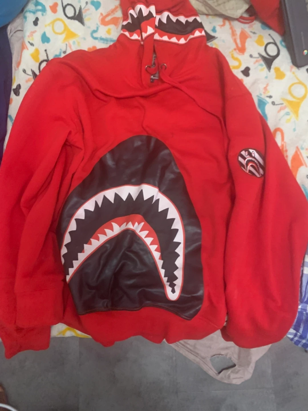 Selling a red BAPE shark hoodie! It features the iconic shark design on the front and floral patterns on the back and sleeves. It's in good condition and ready for a new home