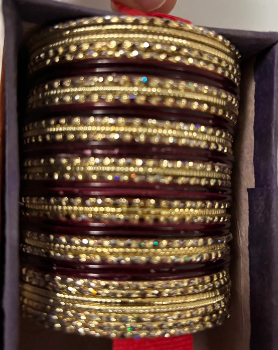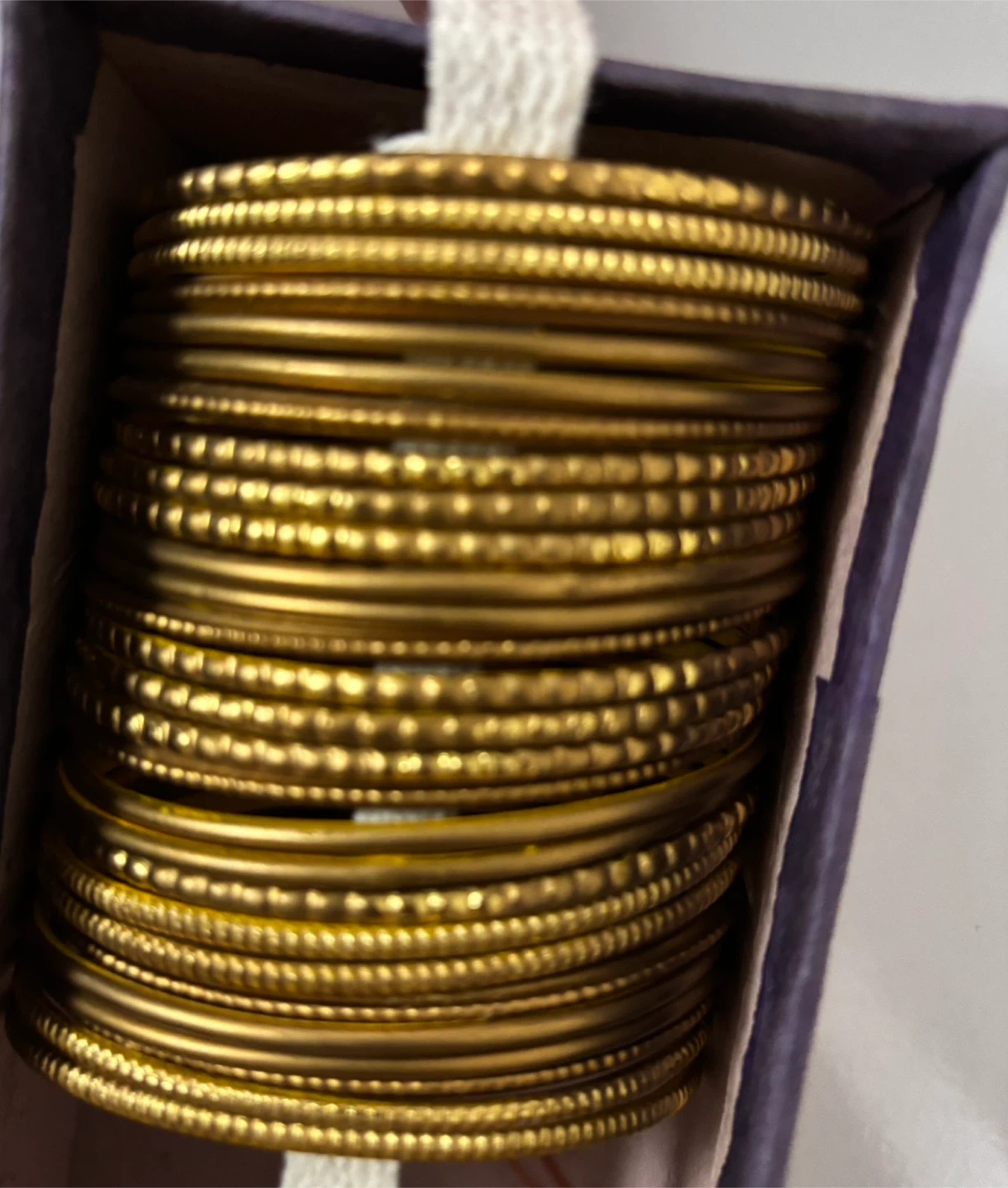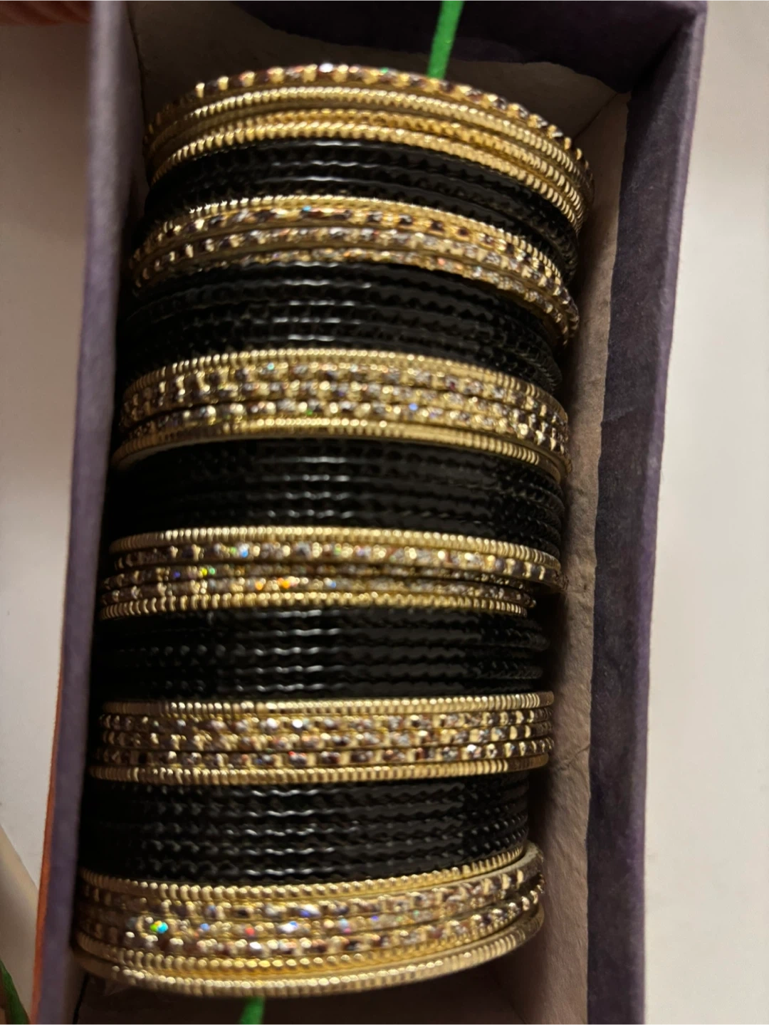 Here's a set of assorted colour bangles. They come in a variety of colours and designs, perfect for adding a touch of sparkle to any outfit. Each set for $15.