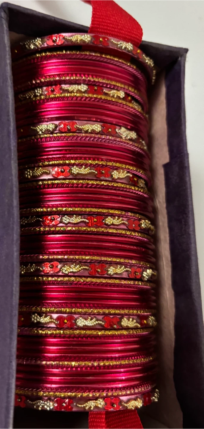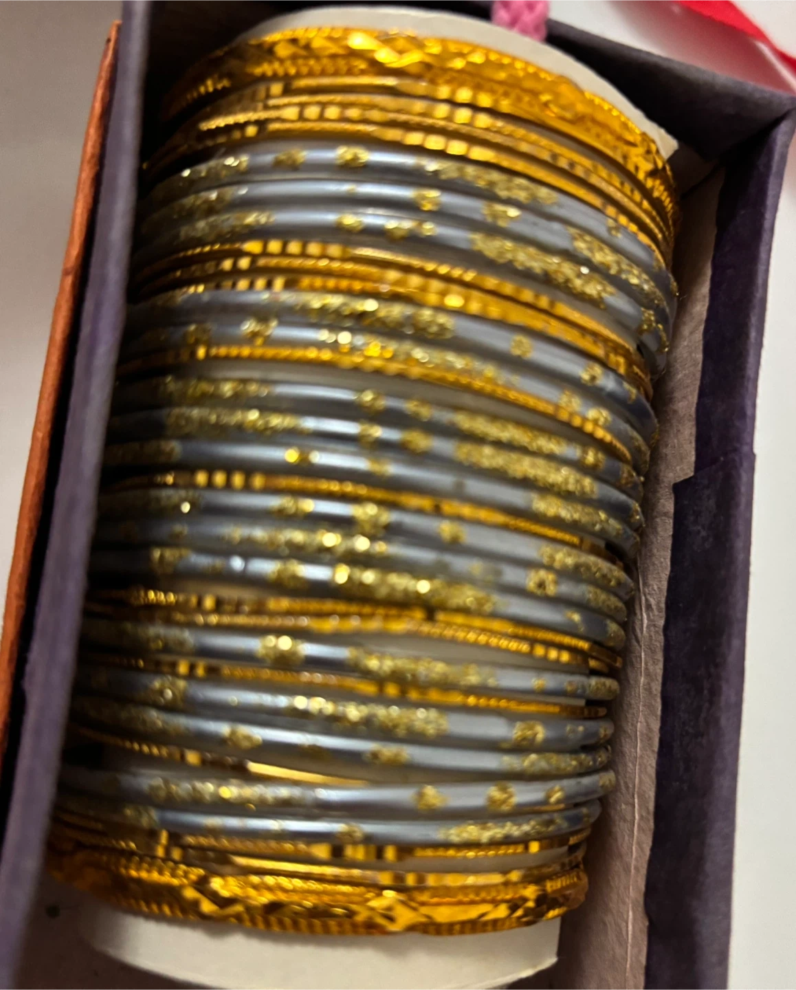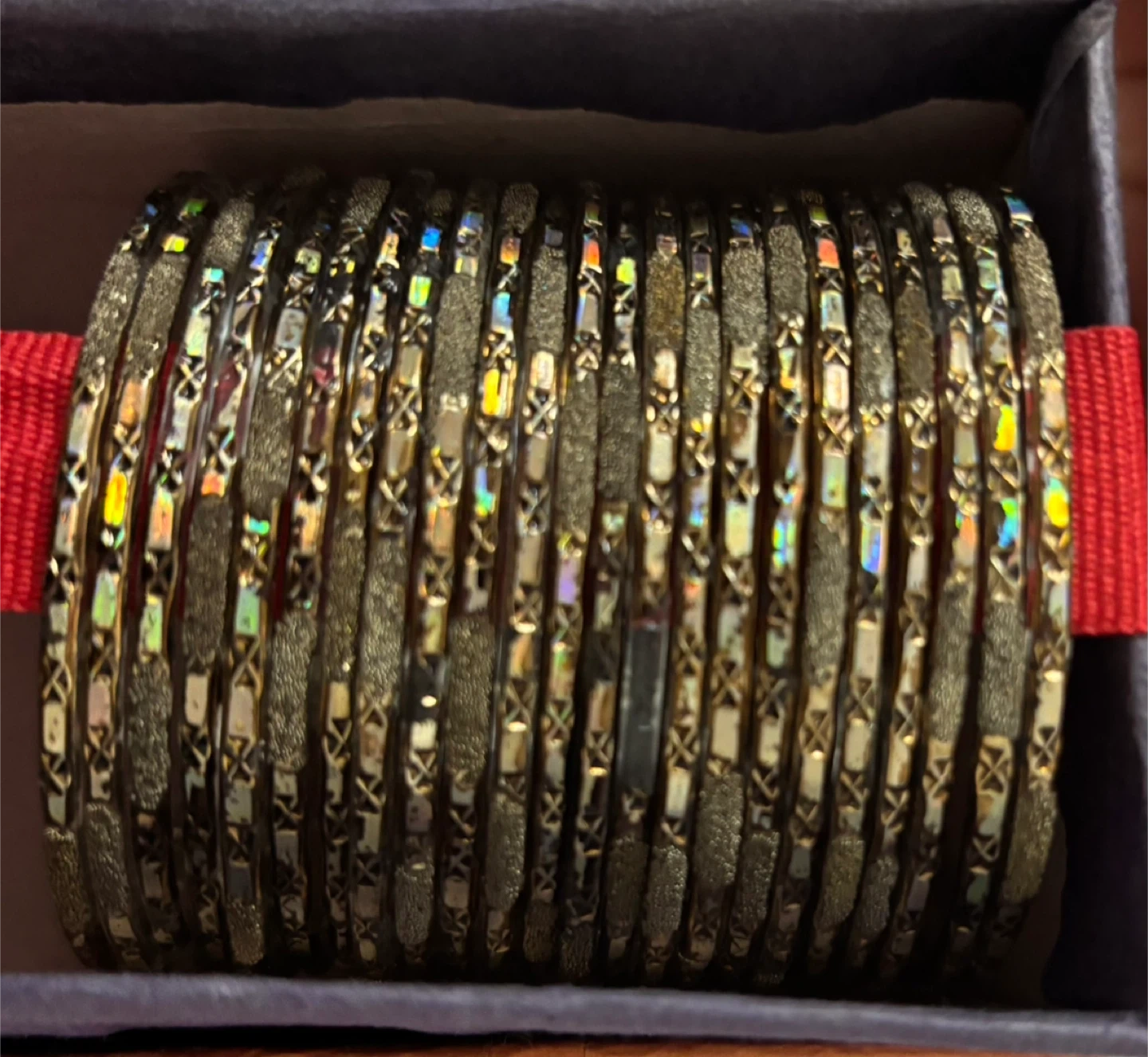 Here's a set of assorted colour bangles. They come in a variety of colours and designs, perfect for adding a touch of sparkle to any outfit. Each set for $15.