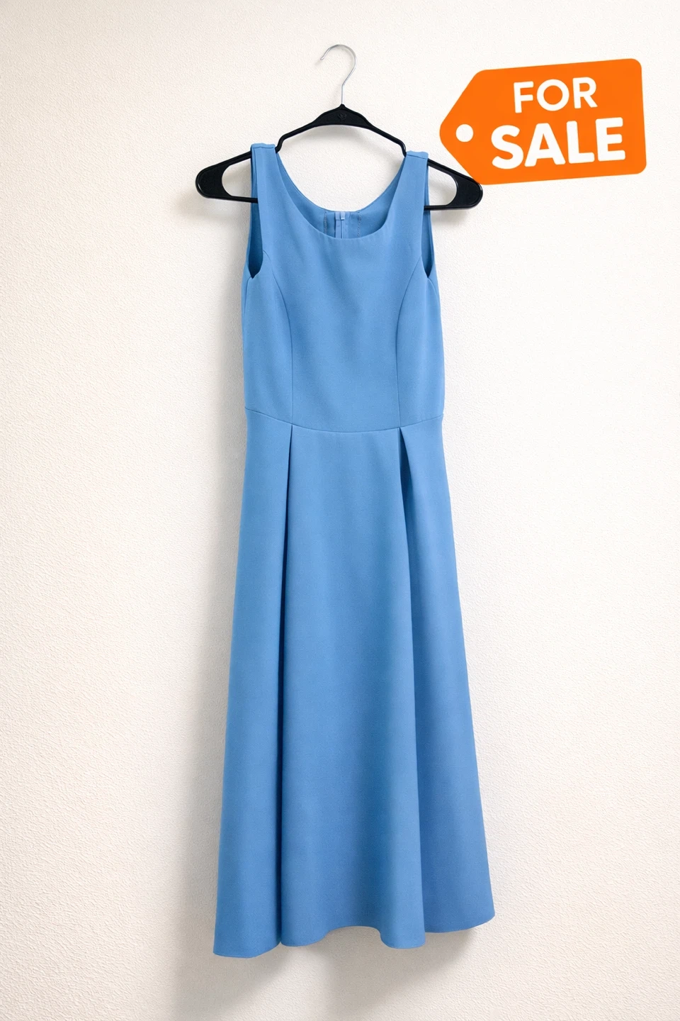 A beautiful blue sleeveless maxi dress with a fitted bodice and a pleated skirt. It features a scoop neckline and a concealed zipper closure at the back. Dress length is approximately 53 inches.