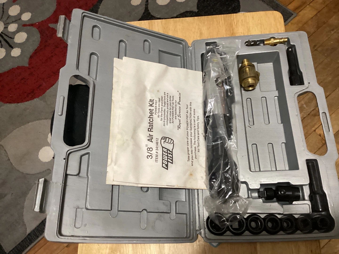 This is a 3/8" Air Ratchet Kit from POWER FIST. It includes an air tool, sockets, and a fitting. It comes with a hardshell case for storage and transport. Great for mechanical work!