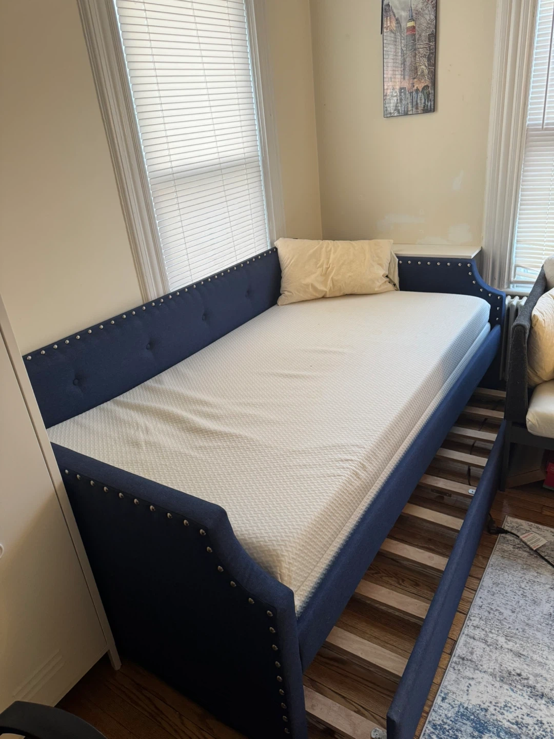 This daybed features a deep blue upholstered frame with decorative studded trim. It includes a white mattress. Its design makes it a versatile piece for seating or sleeping.