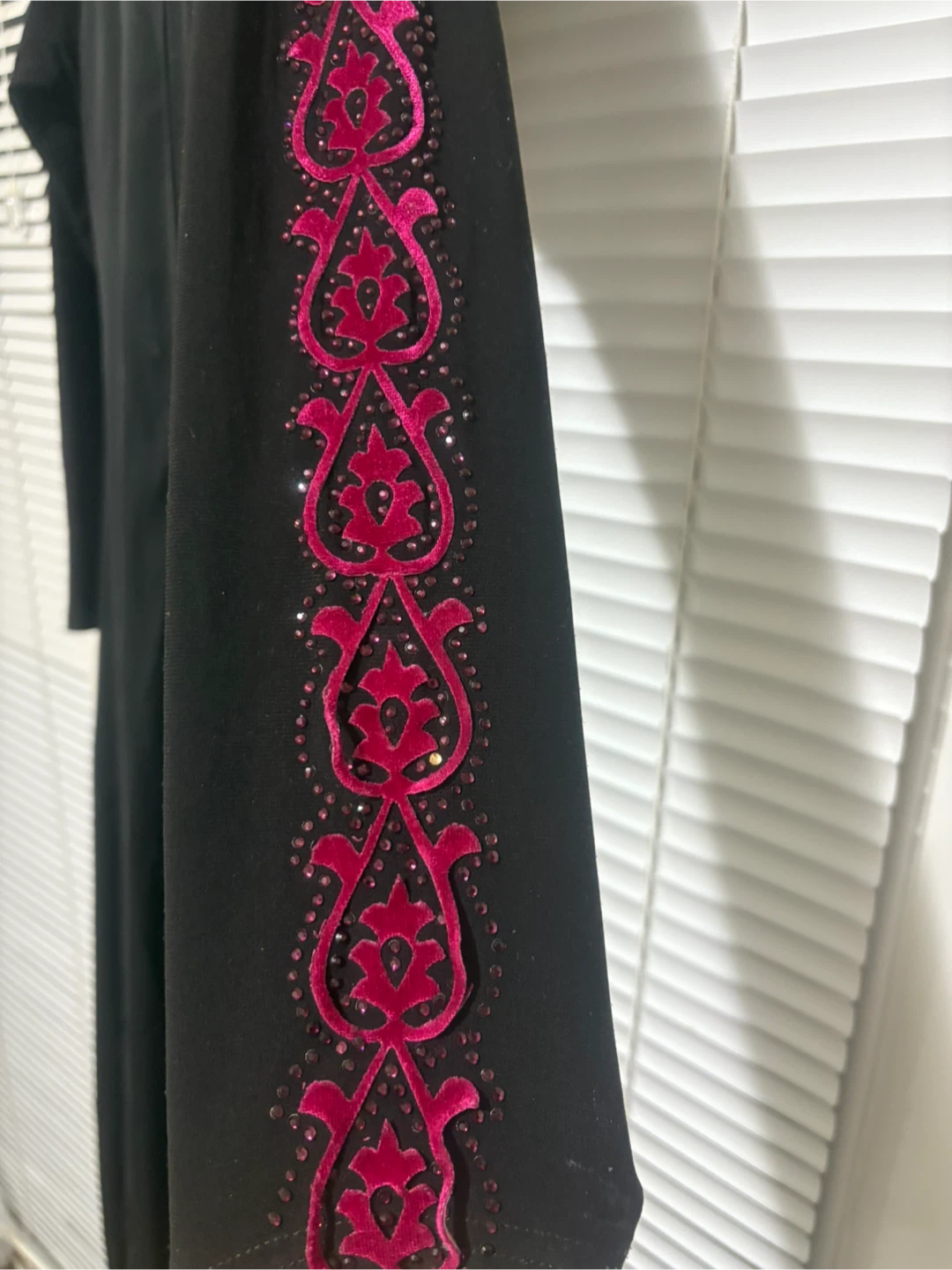 Selling a black abaya with lovely pink embellishments along the sleeves with good material no need of iron . Pick up only ( size m )