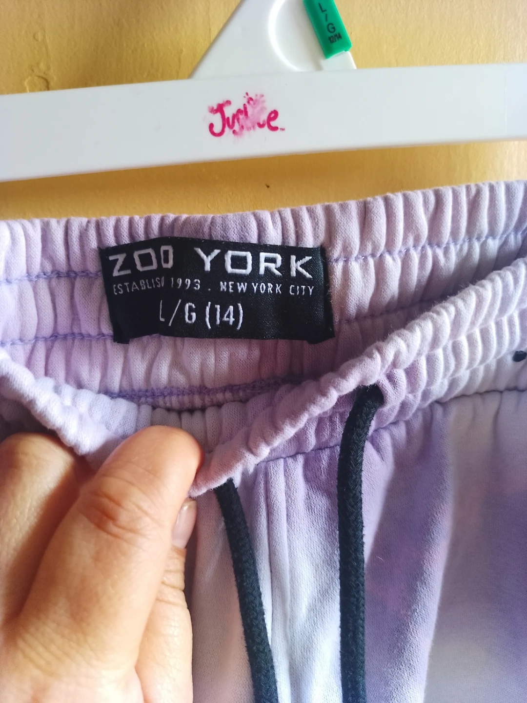 These Zoo York joggers have a cool tie-dye pattern in purple and white. They're size L/G (14) with an elastic waistband and drawstring. Great for casual wear!
