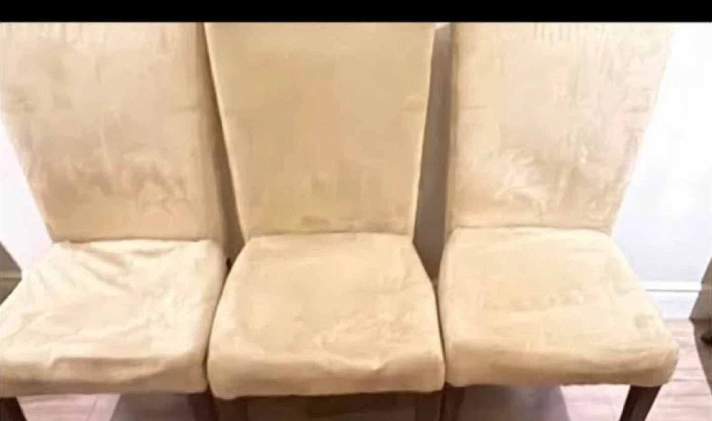 Selling a set of four beige dining chairs. These chairs feature upholstered seats and backs. Their neutral colour makes them a versatile addition to any dining room. Perfect for family dinners or entertaining guests!