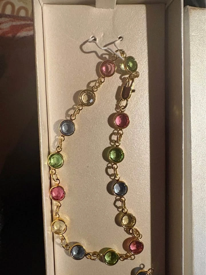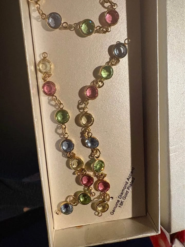 Sparkling 18K gold plated set with genuine diamond accent and pretty multi-color gemstones. Includes earrings (need hooks), bracelet, and necklace. Still in the box. Great for gifting or for yourself! Pickup/ cash only. SE Vancouver. Victoria Drive & E 61 Ave.