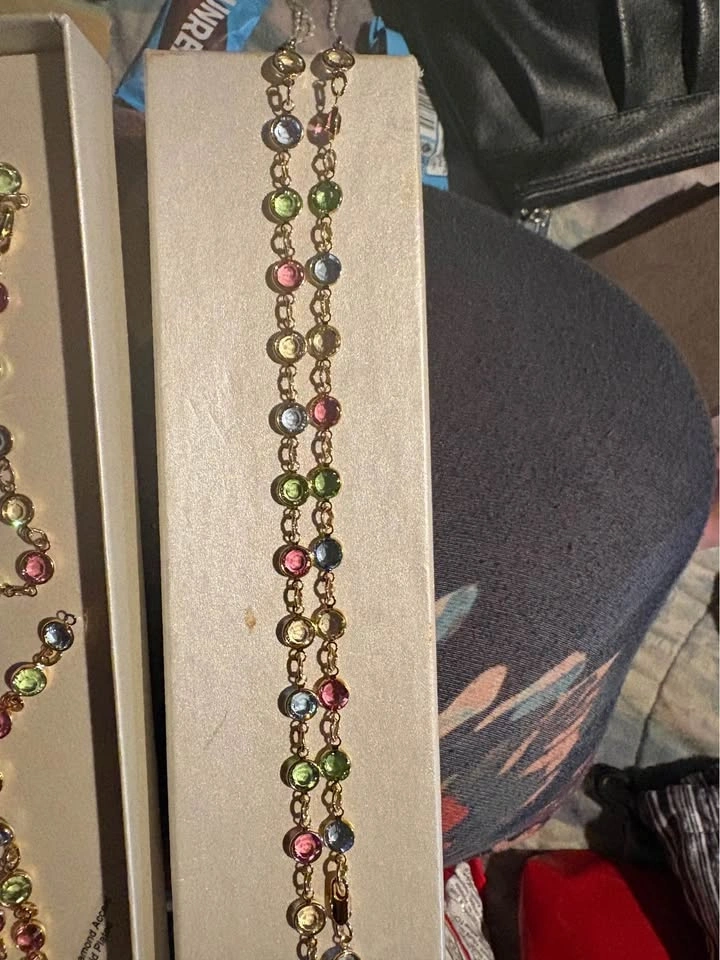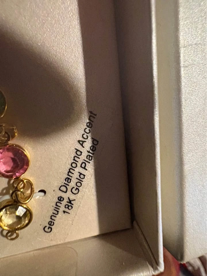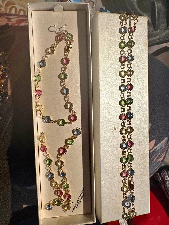 Sparkling 18K gold plated set with genuine diamond accent and pretty multi-color gemstones. Includes earrings (need hooks), bracelet, and necklace. Still in the box. Great for gifting or for yourself! Pickup/ cash only. SE Vancouver. Victoria Drive & E 61 Ave.
