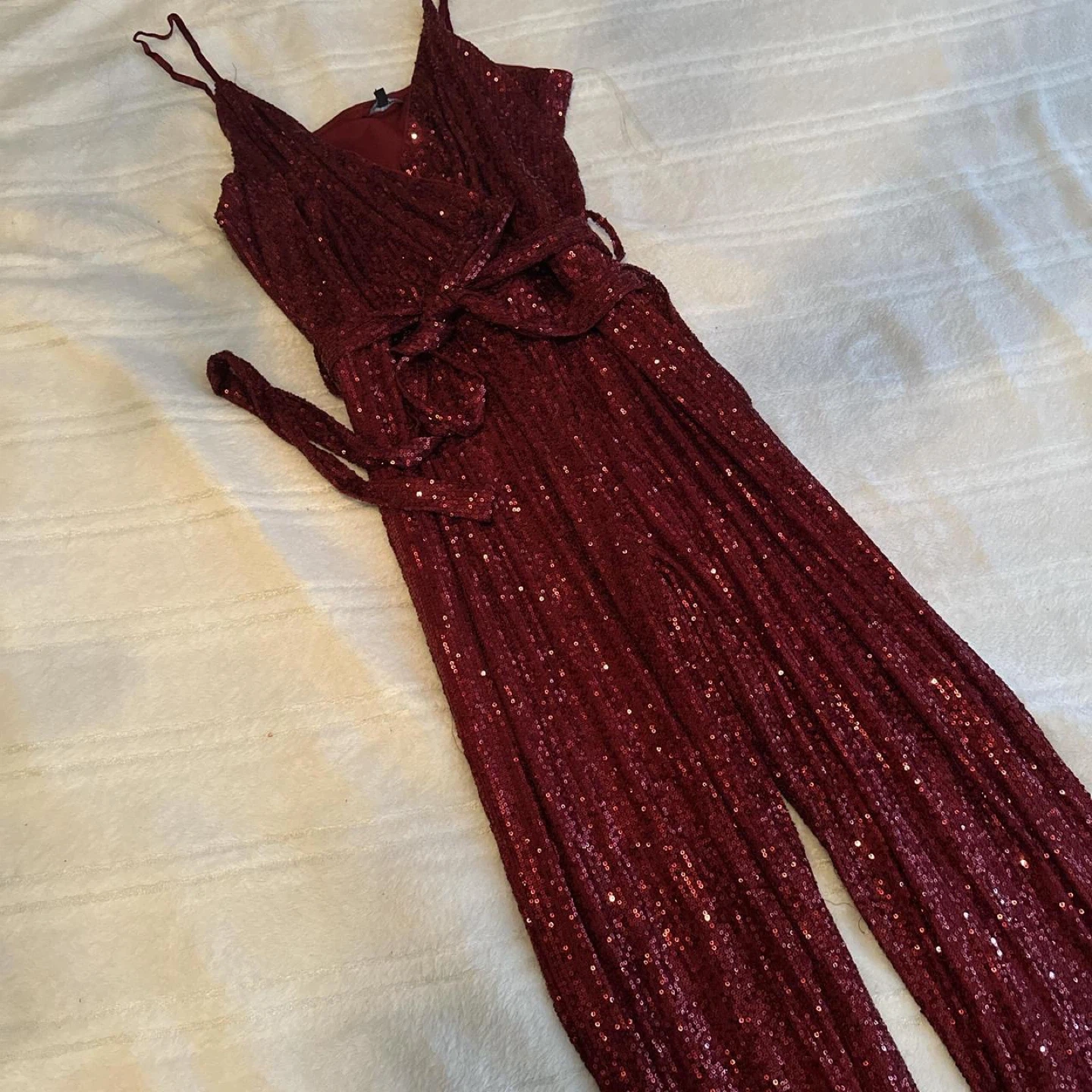 Here's a burgundy sequin jumpsuit! It features a tie waist and spaghetti straps. It's in great condition and ready for a new owner!