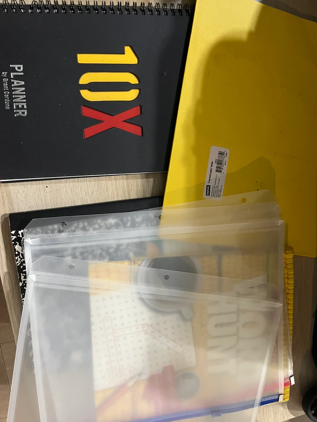 This is a 10X Planner by Grant Cardone. It's a spiral-bound planner with a black cover. Also included are several clear plastic 2-pocket folders from Staples.