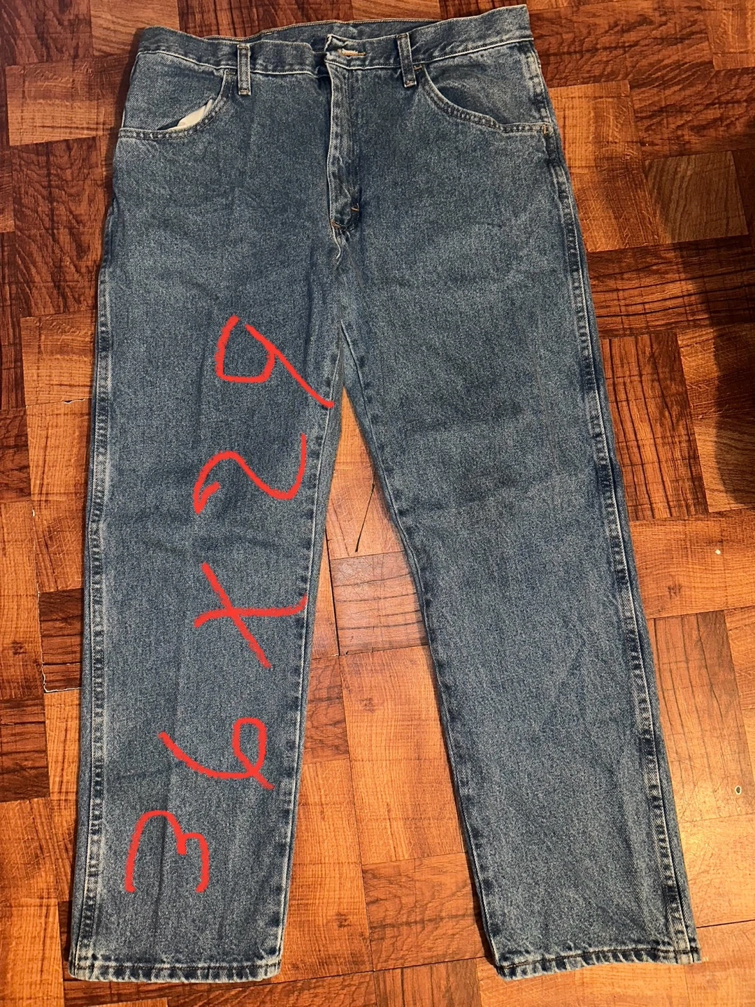 Classic blue denim jeans for men. These are a size 36 waist and 32 inseam. Comfortable and durable for everyday wear.
