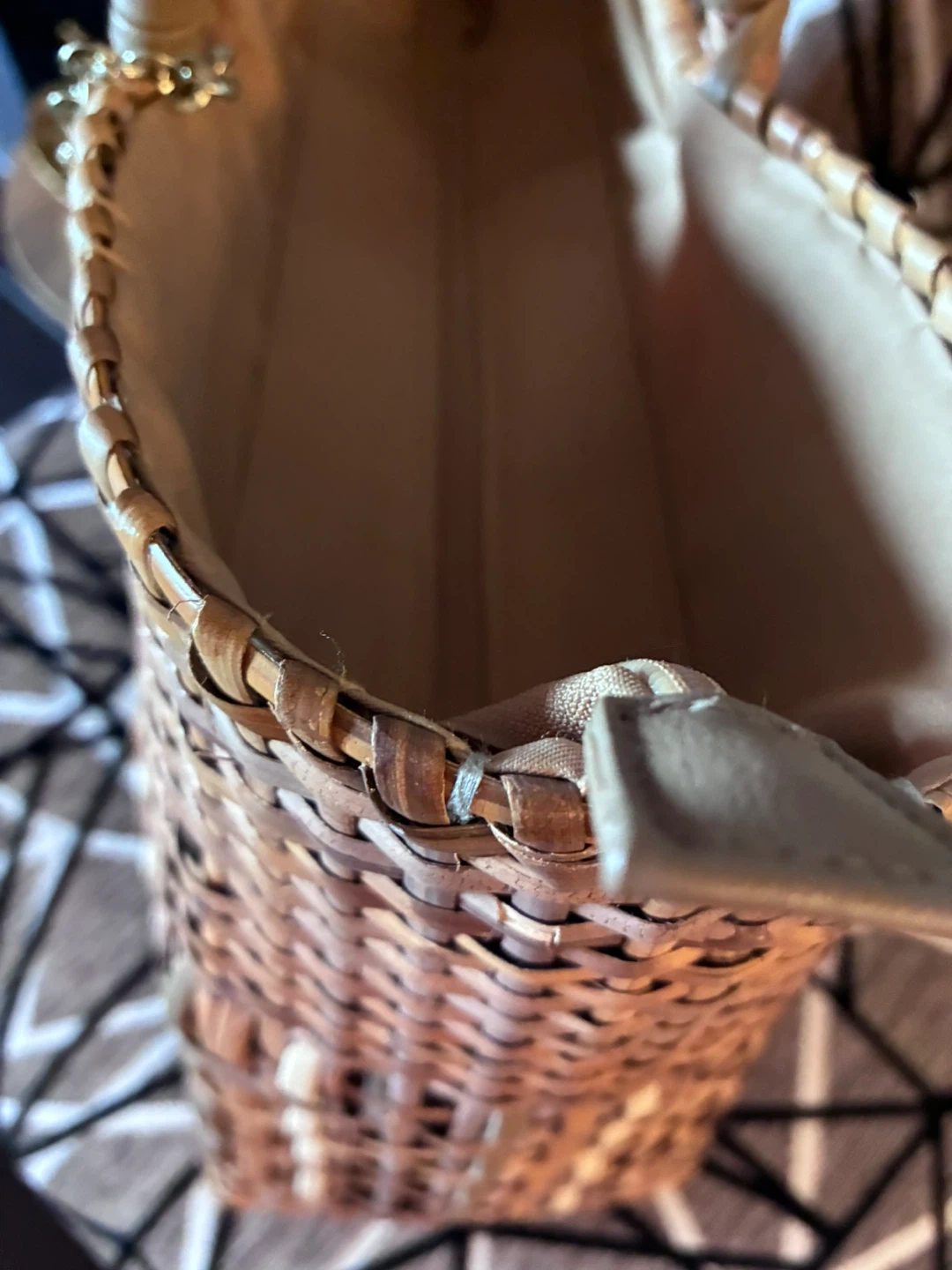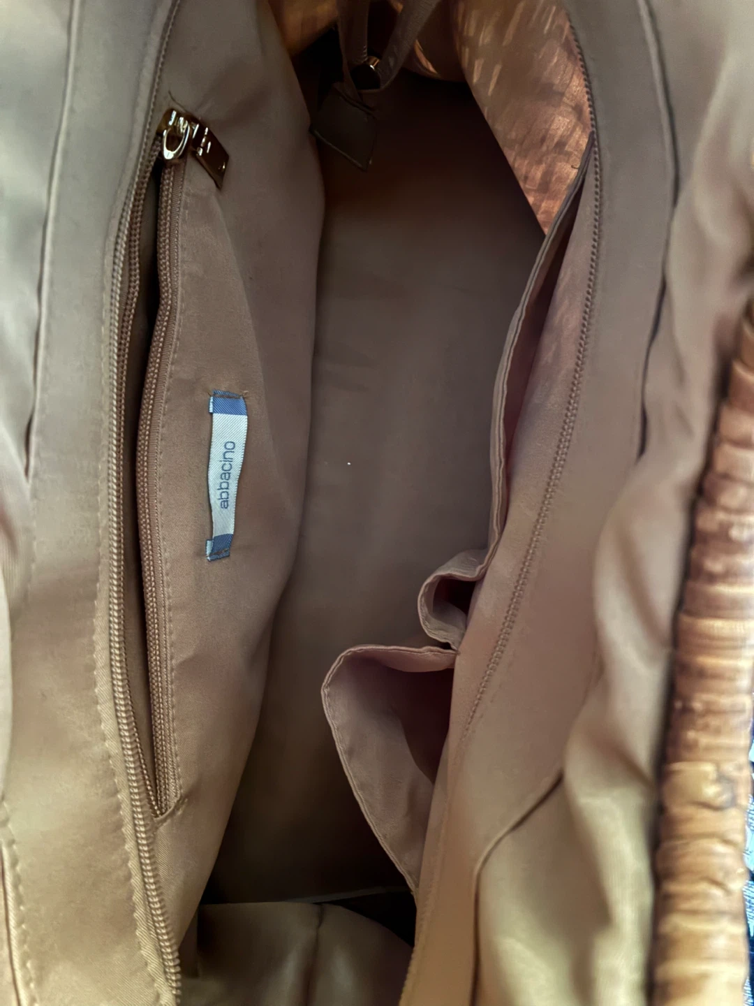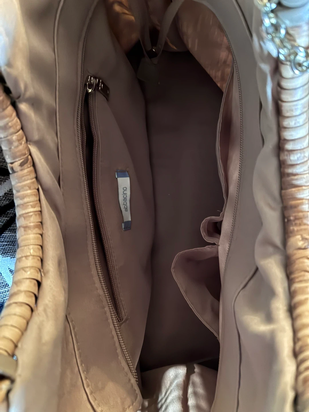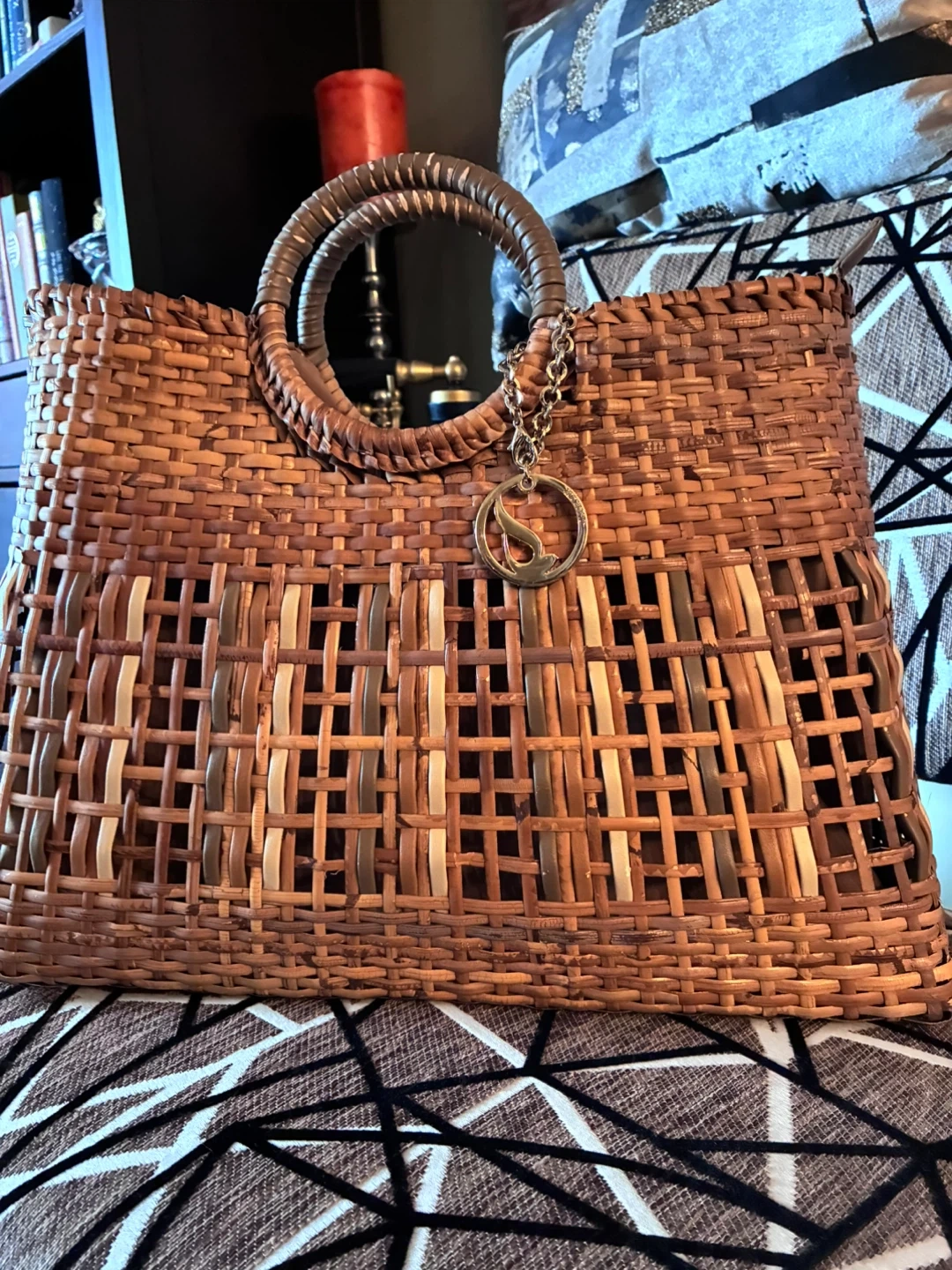 A stylish Abbacino tote bag with a woven straw exterior and fabric lining. It's approximately 11" high, 17" wide, and 6" deep. This bag is great for everyday use or a trip to the market!