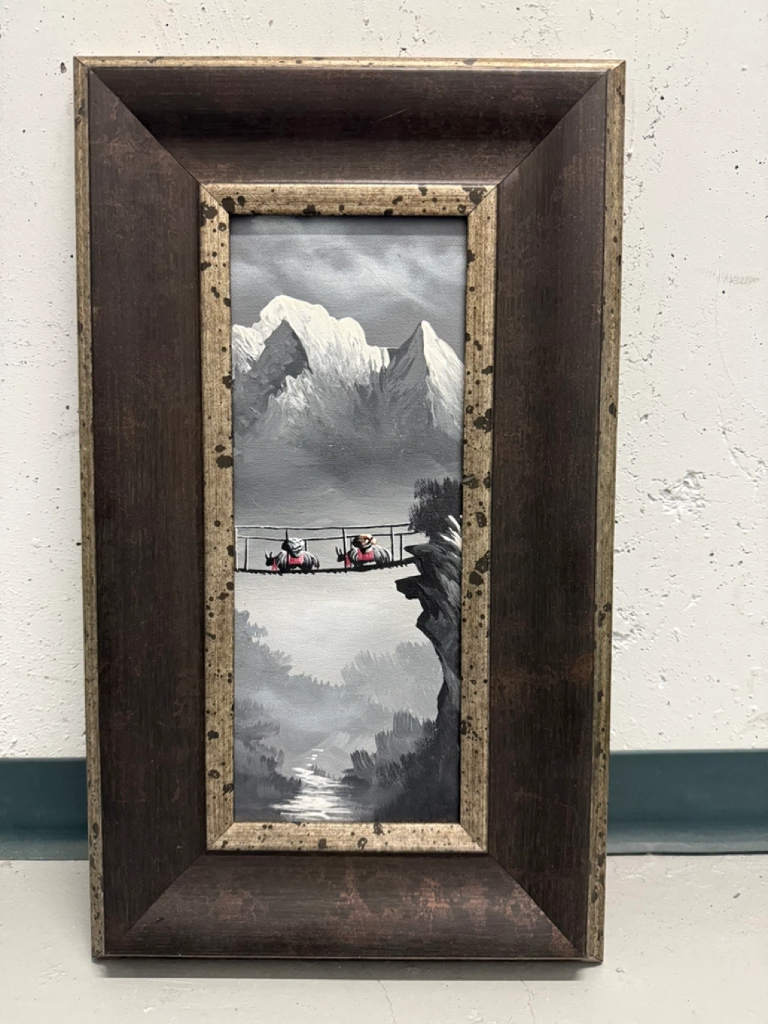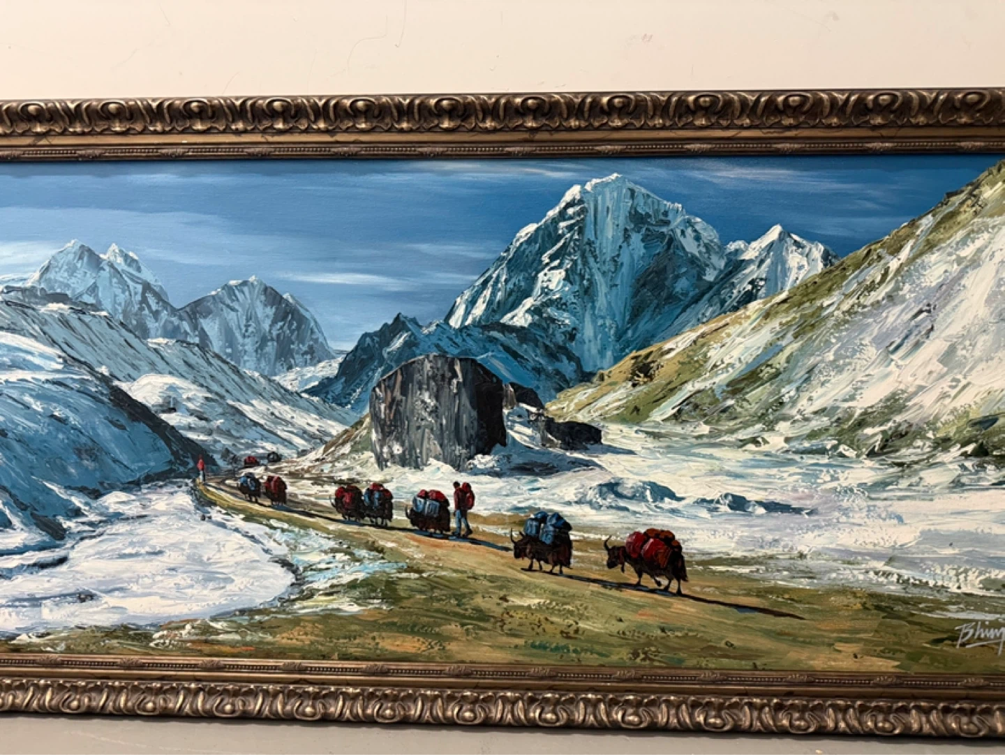 Vintage framed oil painting depicting a snowy mountain scene with yaks and people on a trail. The artwork showcases a rugged landscape with detailed brushwork. Ready to hang for your home decor!