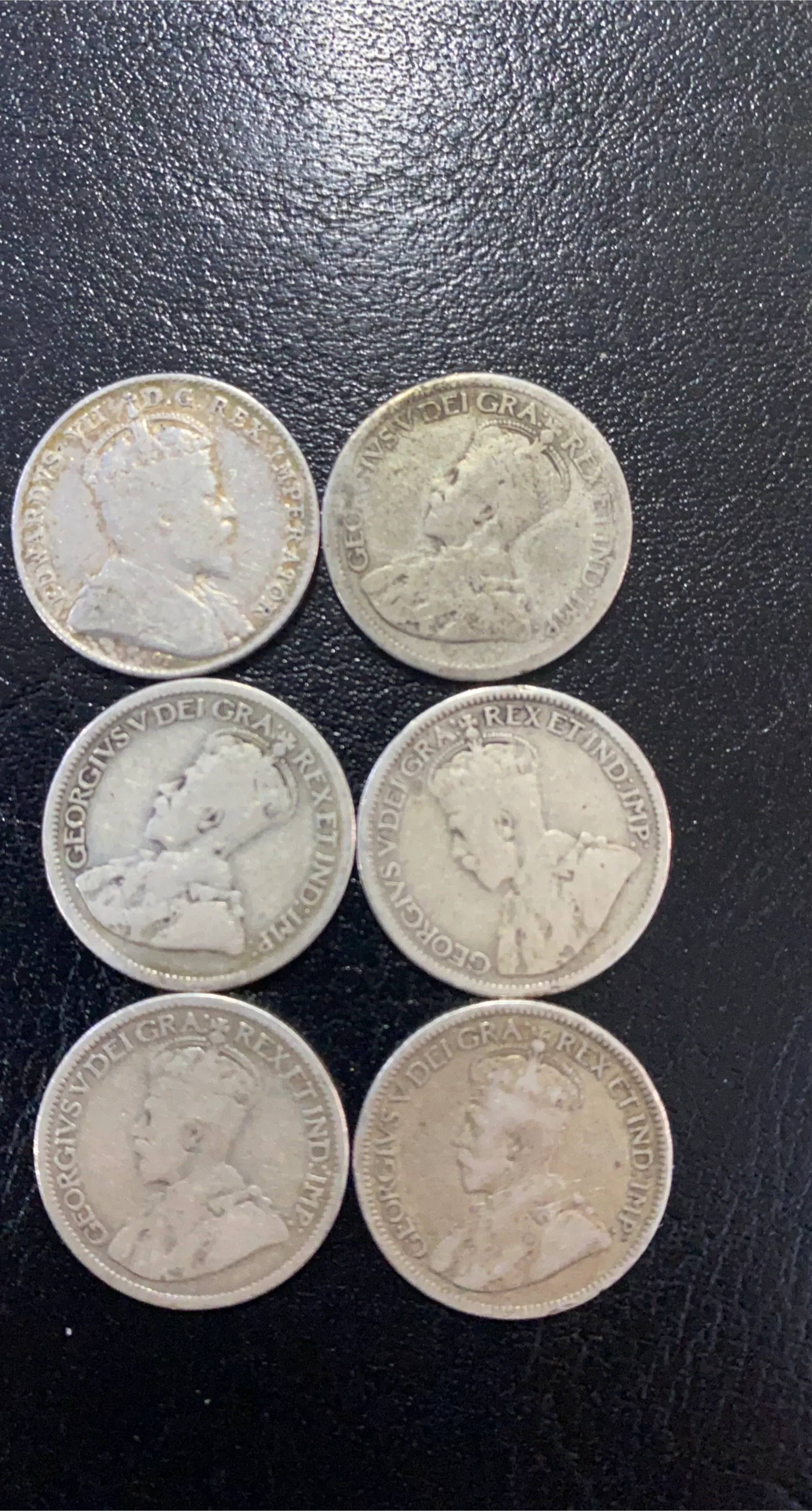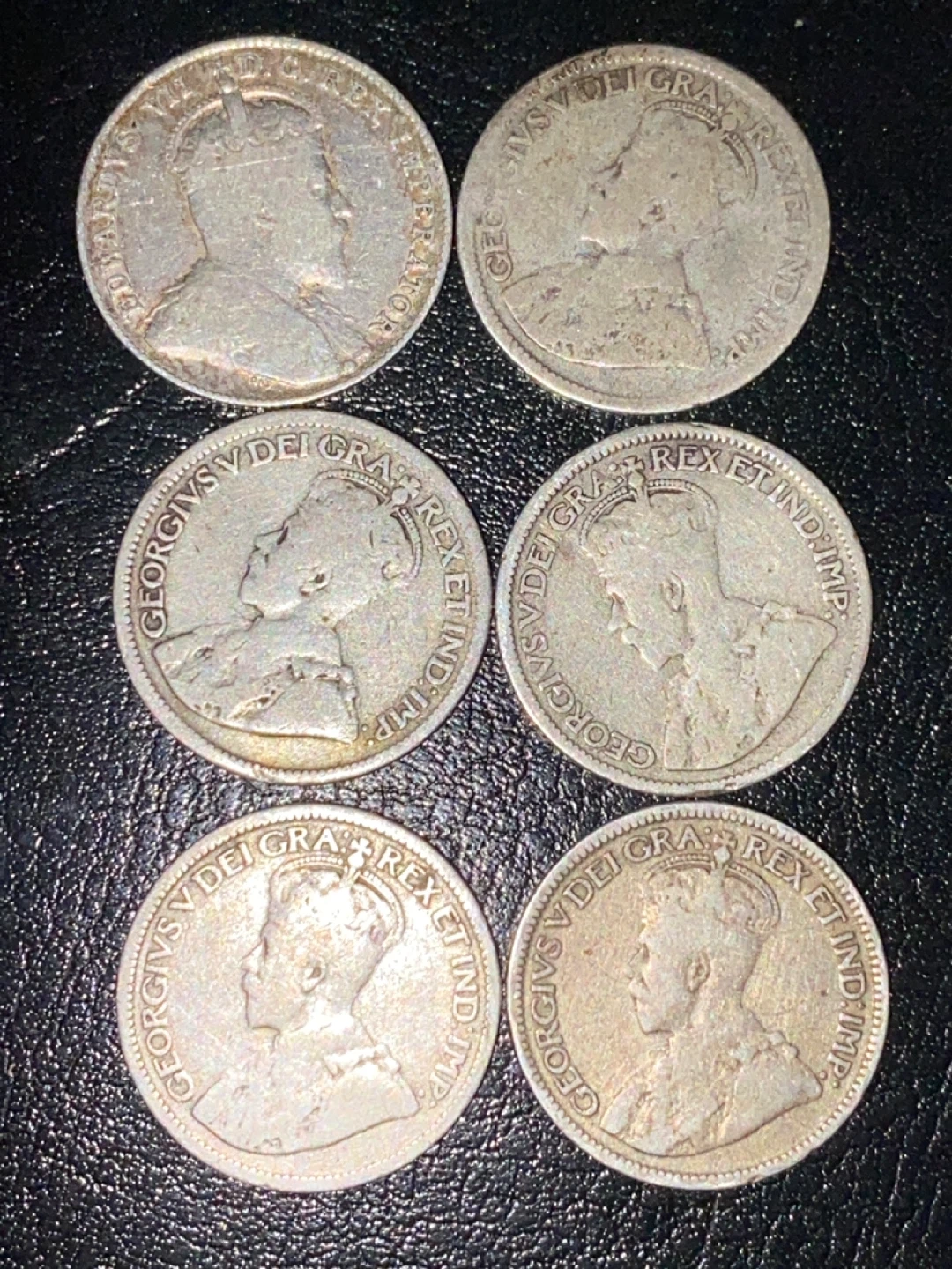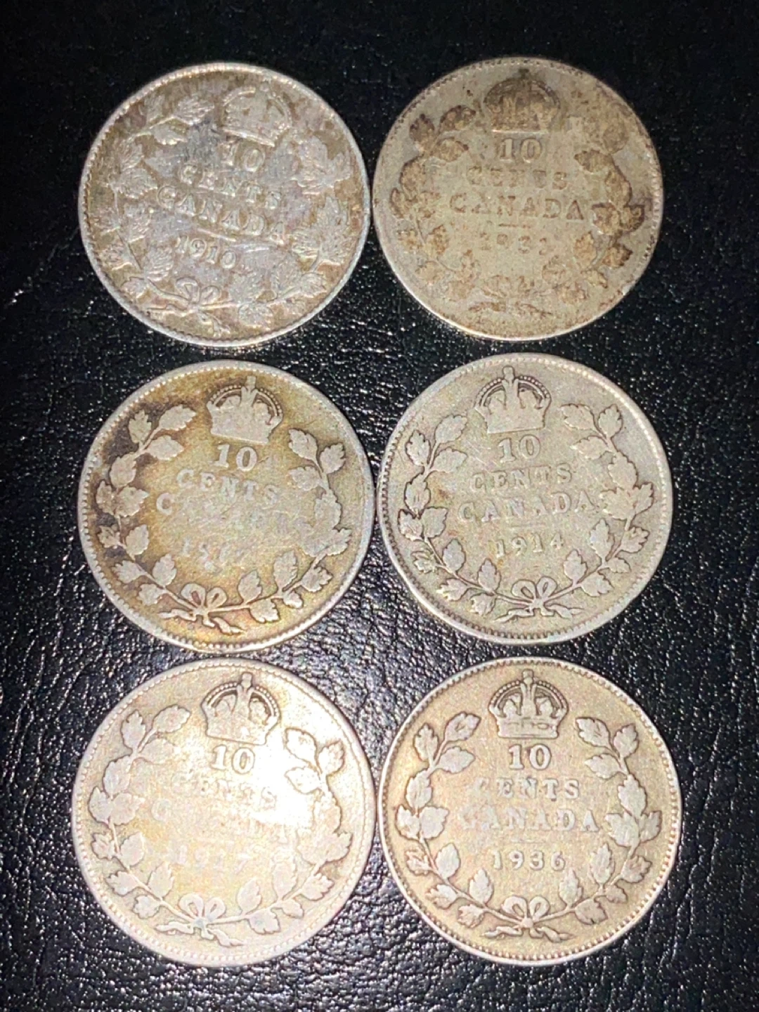Collection of six Canadian 10 cent coins. Dates include 1910, 1911, 1914, 1917, 1936 and one coin with an unreadable year. All coins depict King George V or King George VI. Great for collectors!