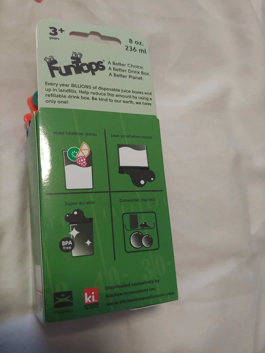 This Funtoops Collegiate Edition drink box is refillable and eco-friendly. It's BPA-free and phthalate free with a leak-proof design when closed. Suitable for kids 3+ years. New in box