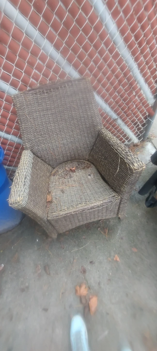 Set of 2 Wicker armchair with a classic design. Made from durable wicker material. It's a comfortable single seating option.not in great condition but I'm going of donations on everything I'm saling and some items are completely free including these. Might be great in backyard they are strudyeven if lookbaf. Very heavy duty as well. Not cheap and dlimpsy