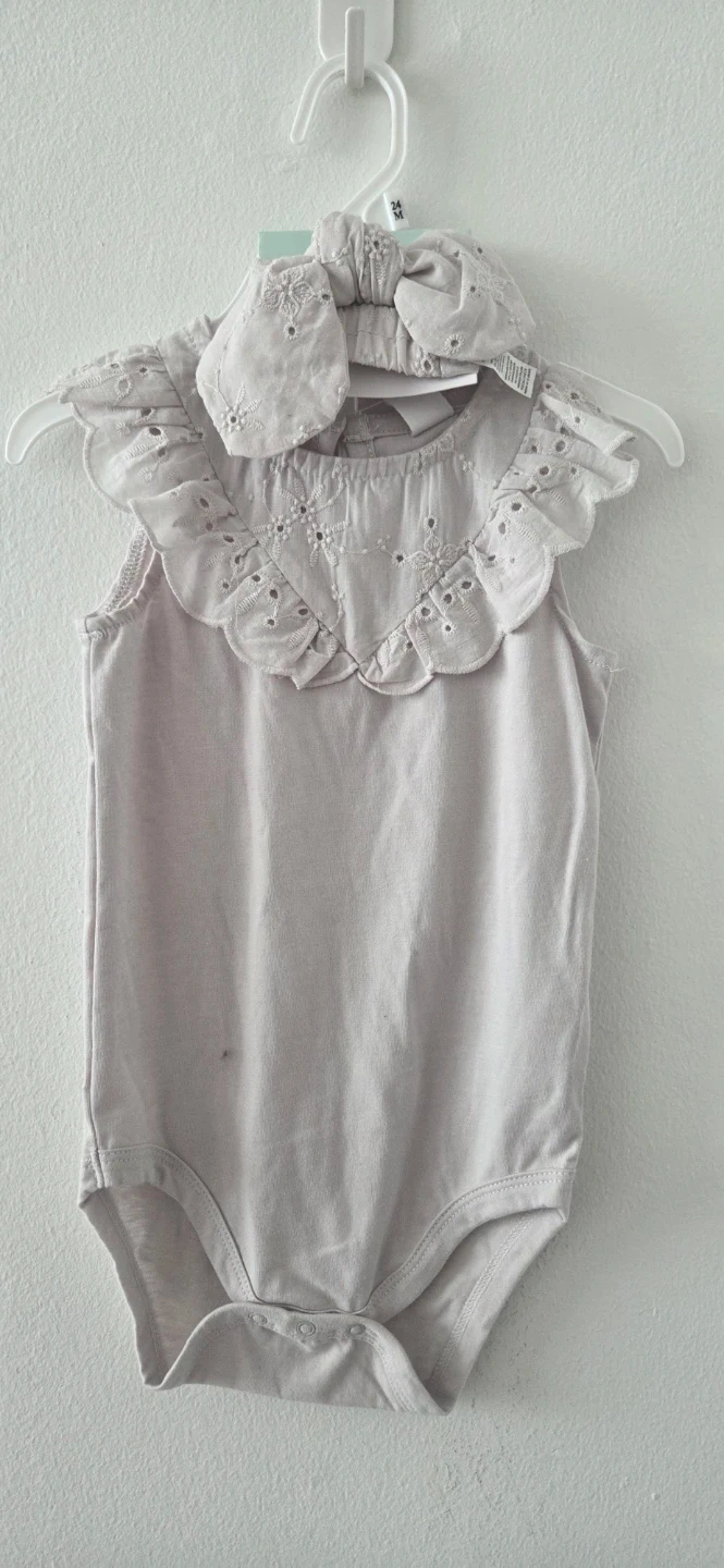 A cute baby girls' bodysuit and matching headband set (2pcs). It features intricate eyelet details and a ruffled collar. The size is 24 months.