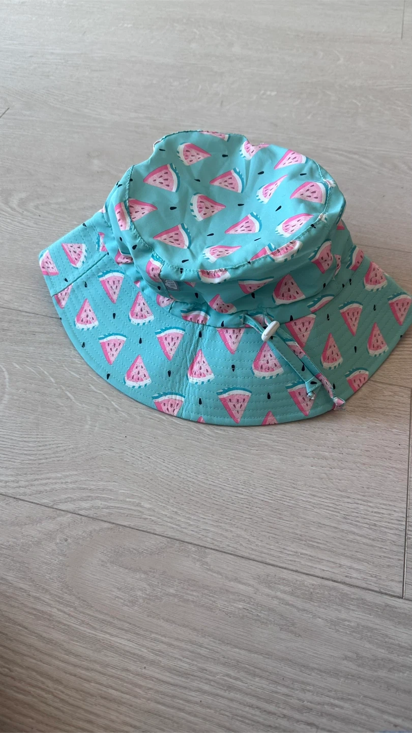 This cute bucket hat features a fun watermelon print on a teal background. It has a chin strap with a toggle for a secure fit. Made from lightweight fabric, it's great for sunny days! Keep little heads protected from the sun with this stylish accessory.