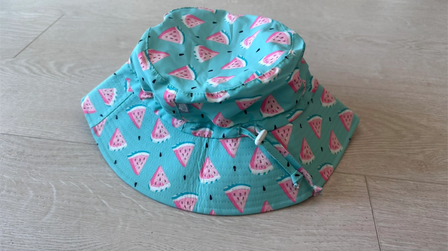 This cute bucket hat features a fun watermelon print on a teal background. It has a chin strap with a toggle for a secure fit. Made from lightweight fabric, it's great for sunny days! Keep little heads protected from the sun with this stylish accessory.
