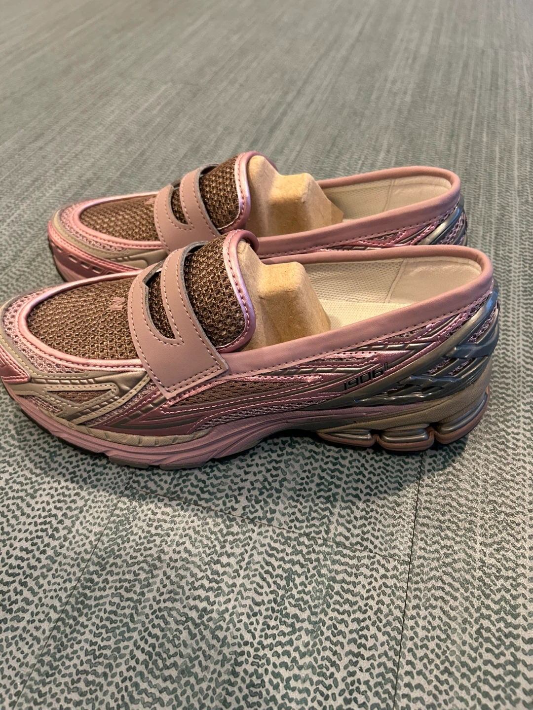These New Balance loafers offer a unique blend of style and comfort. They feature a metallic pink and silver color scheme with mesh detailing. The slip-on design makes them easy to wear.