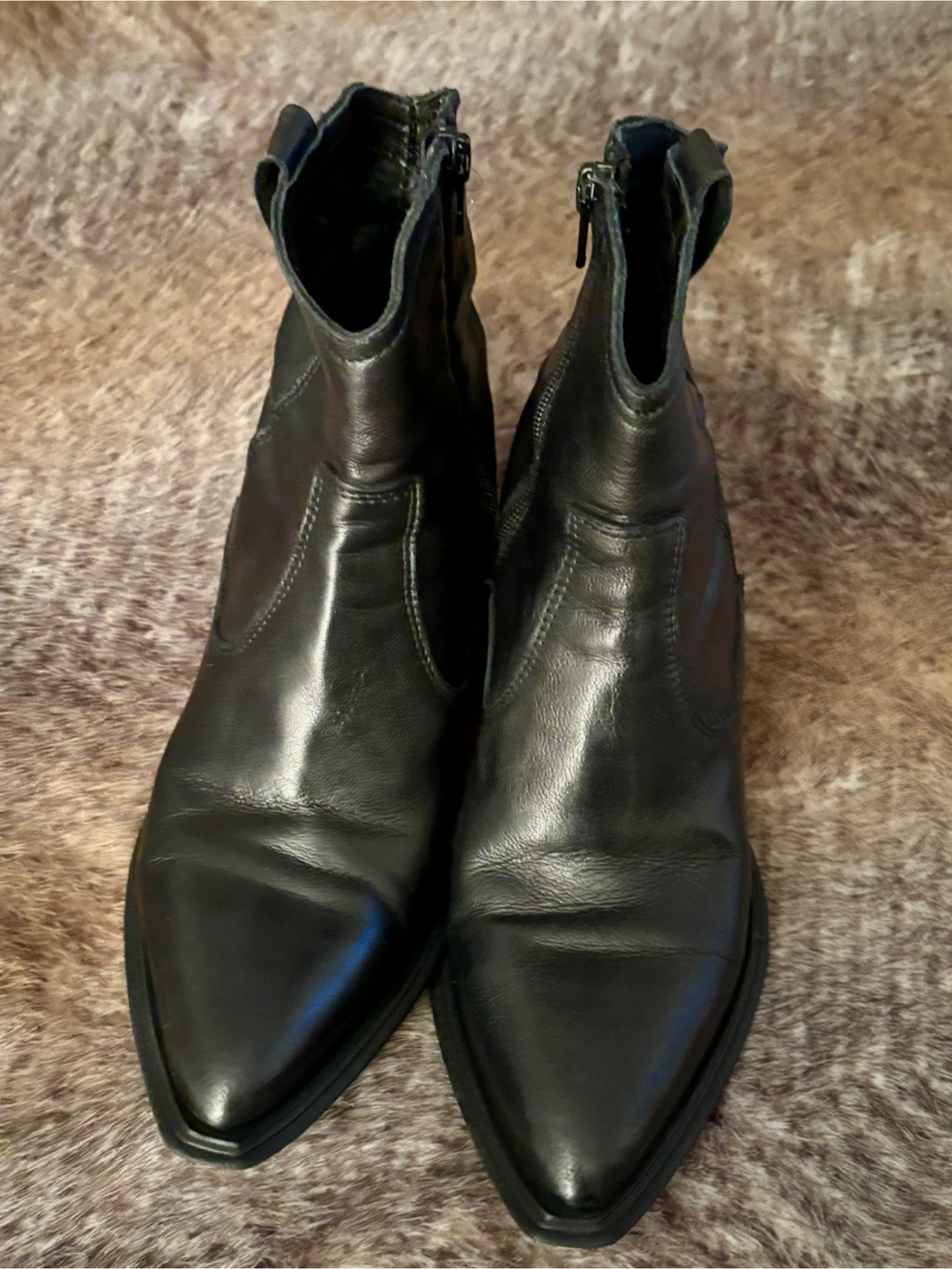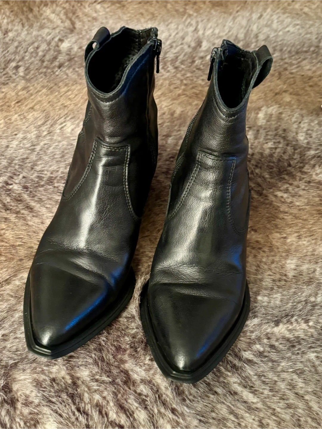 Selling a pair of black leather Emanuele Crasto ankle boots! These stylish boots are made in Italy. The size is 38. Comfortable, used. They're perfect for adding a touch of Italian flair to your wardrobe!