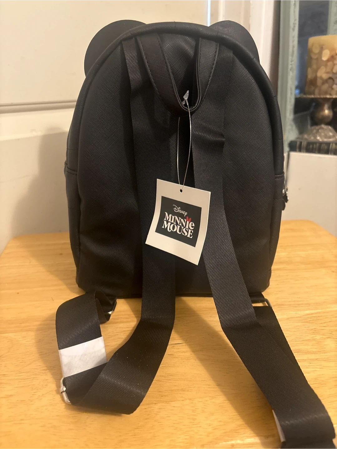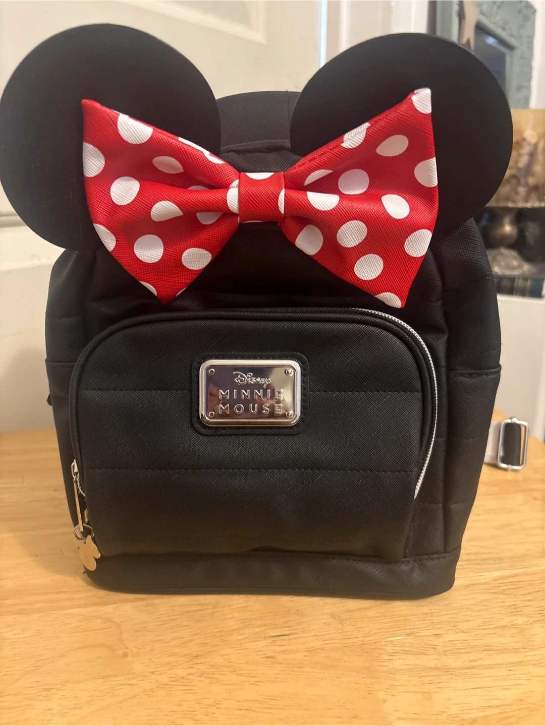 Black mini backpack featuring Minnie Mouse ears and a red polka dot bow. It has a front zippered pocket and Mickey Mouse-shaped zipper pulls. Made from faux leather material.