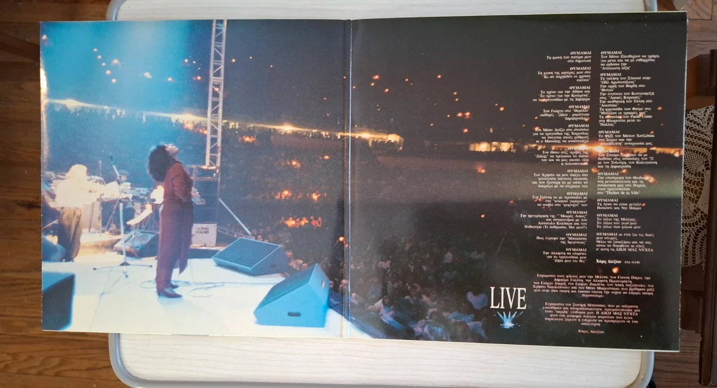 This is a live vinyl record by Alexiou titled 'H Diki Mas Nyxta'. It features a live recording from the 6th of October 1990. The record includes a gatefold sleeve with lyrics.