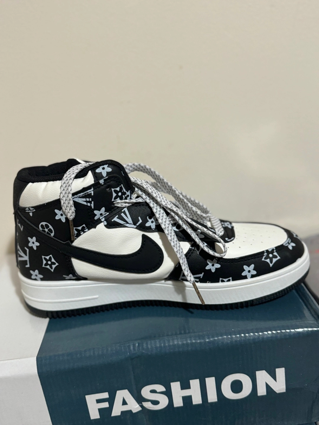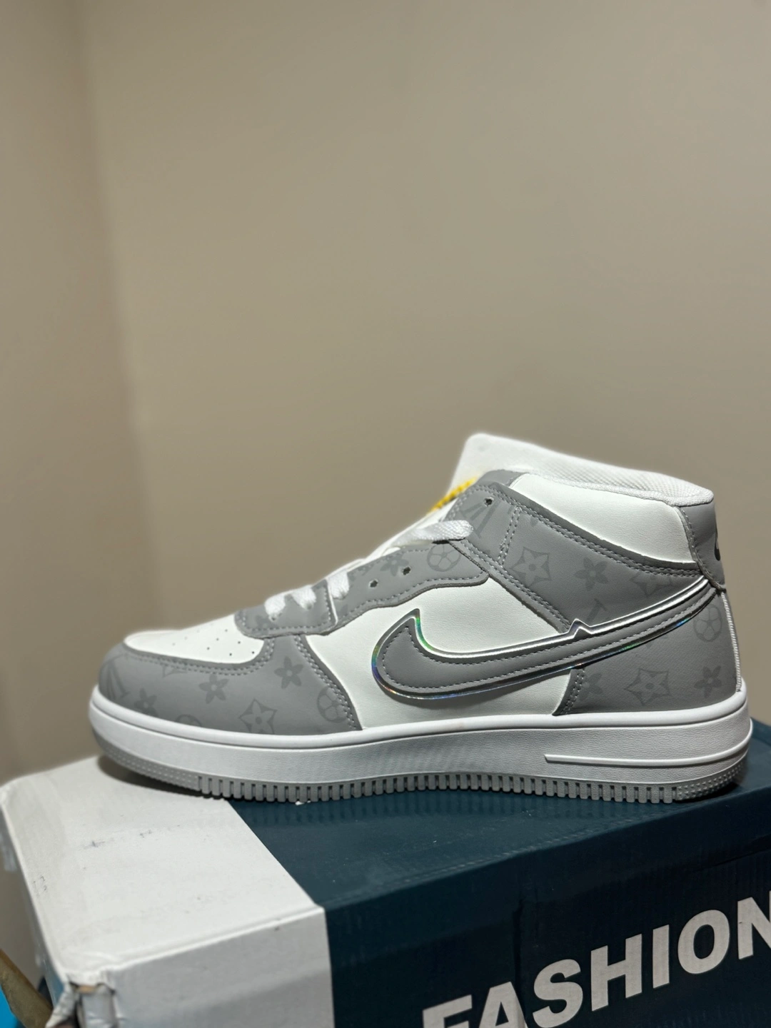 A pair of Air Jordan 4 style sneakers and a pair of Nike Air Force 1 Mid inspired sneakers are available. One pair features a white and black design with speckles. The other pair is a mid-top with a grey and white colourway, showcasing a repeating monogram pattern. Both pairs have a classic sneaker silhouette.