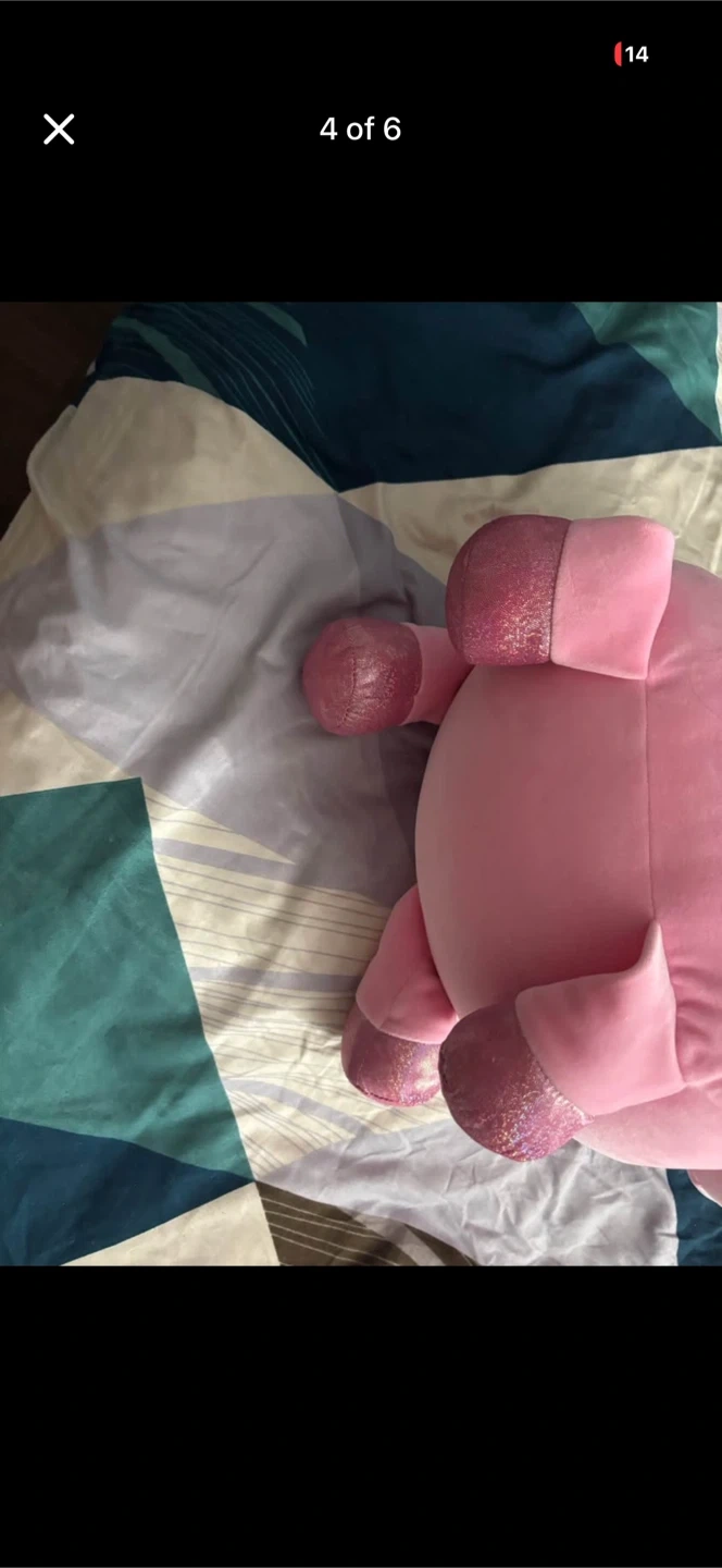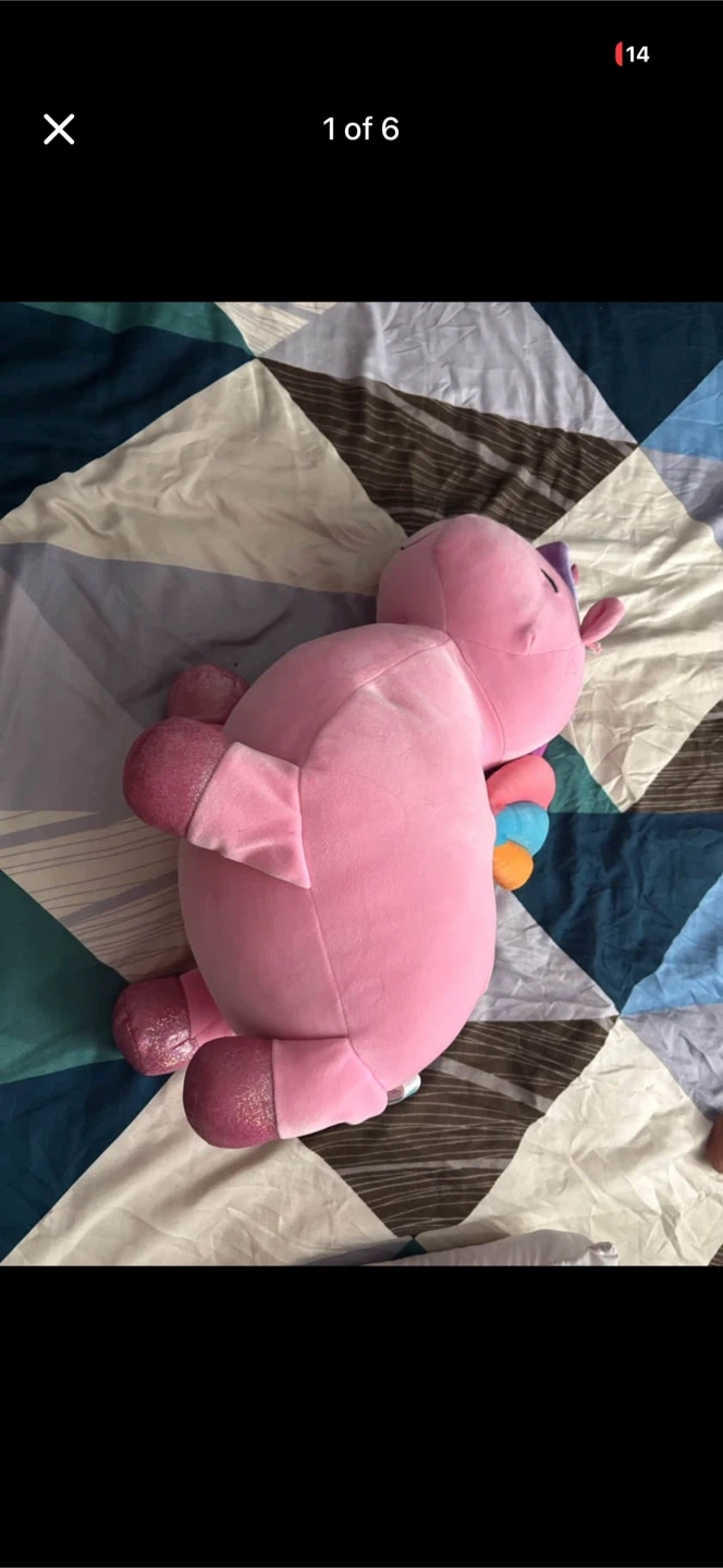 This is a soft, pink plush stuffed animal toy with a sparkly horn and hooves. It features a simple smiling face with dot eyes. The toy measures approximately 15 inches in length across the torso. It's made of a fuzzy, soft material perfect for cuddles.smoke free pet free home .. pick up 551 Emerson street . Coquitlam . Cash only. No delivery. No e-transfer