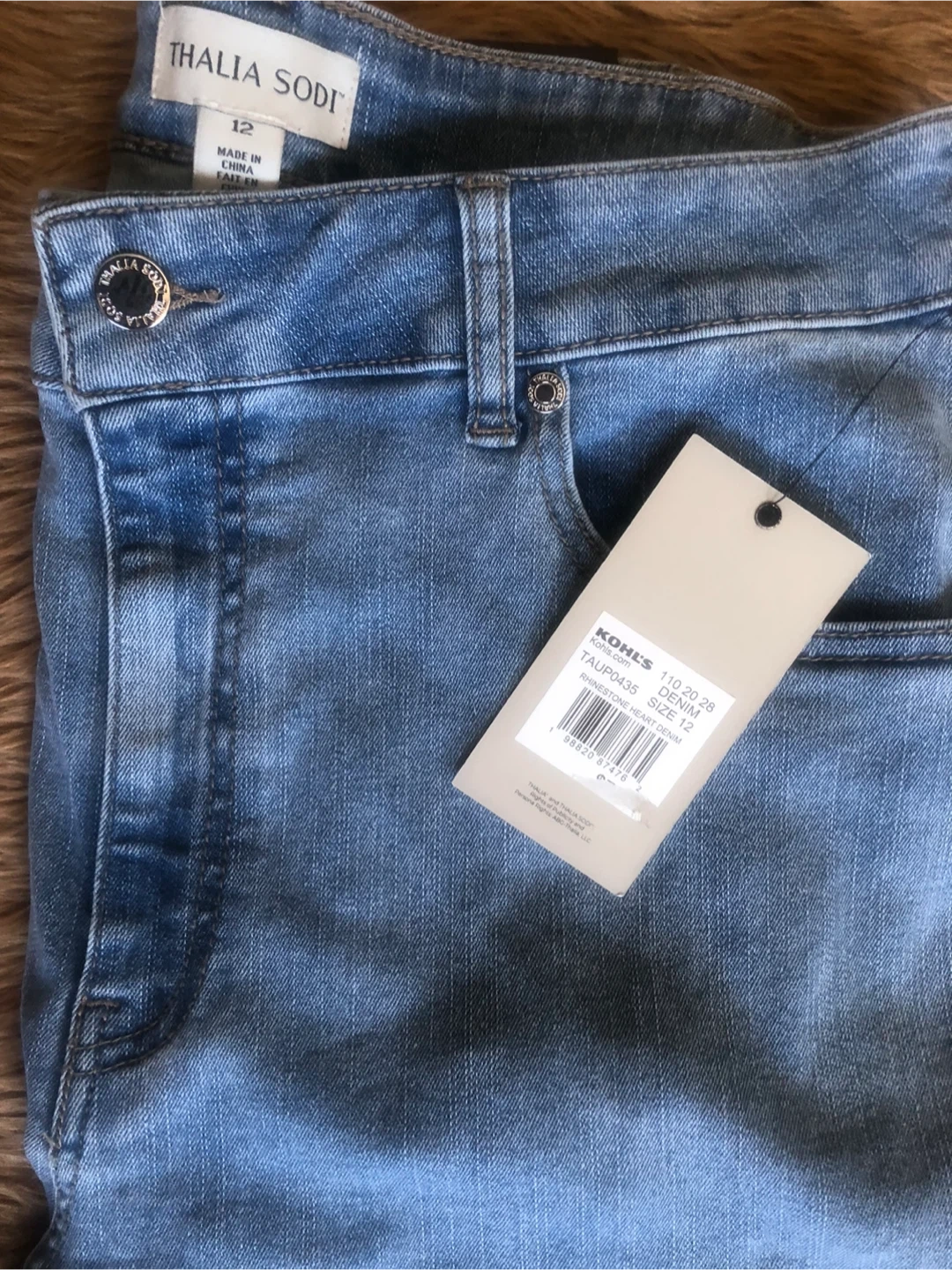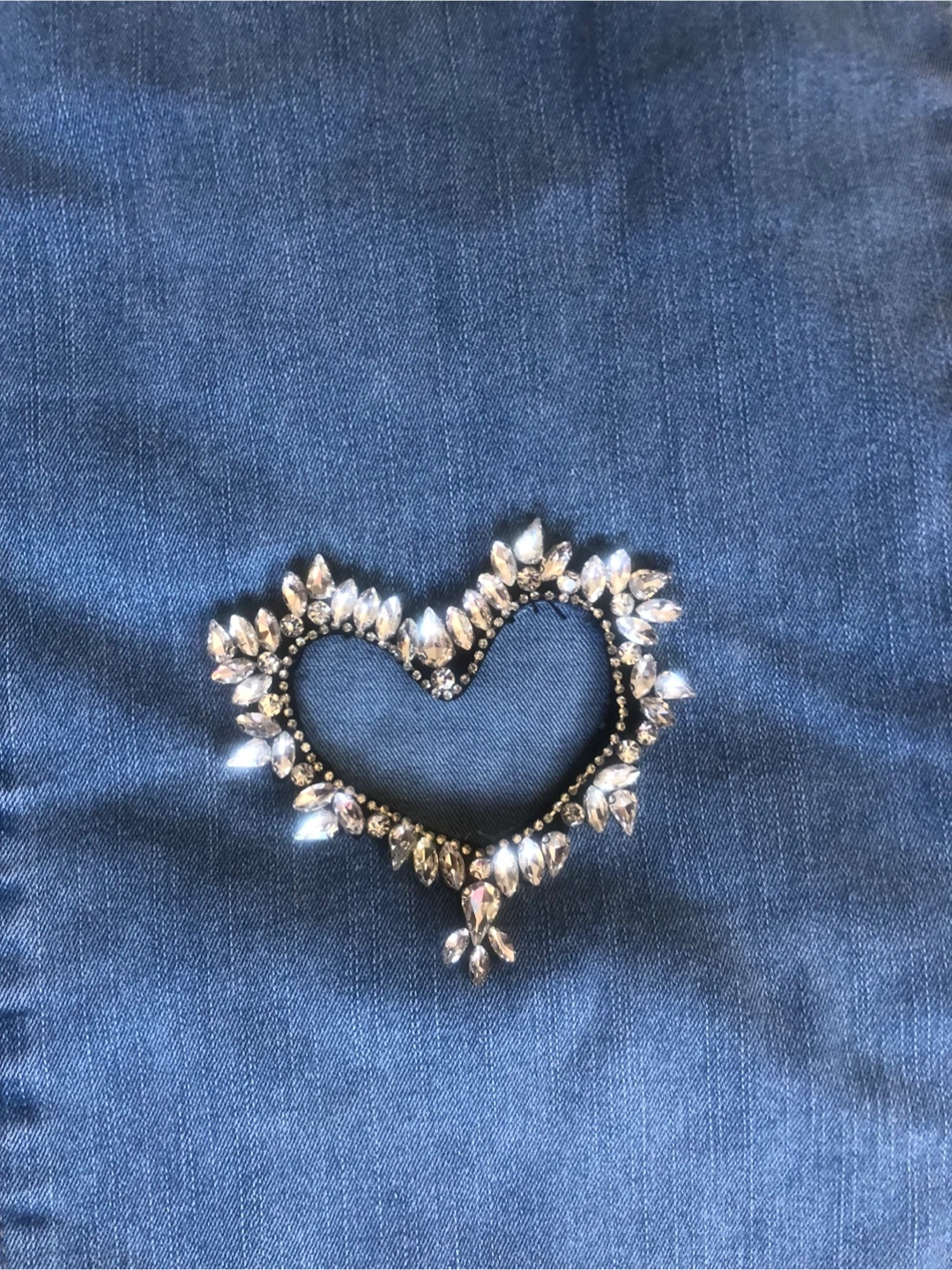 33 waist streachy material denim jeans feature a unique rhinestone-embellished heart design on the leg. They are a size 12 and made from a comfortable denim fabric. Perfect for adding a touch of sparkle to your casual outfits!