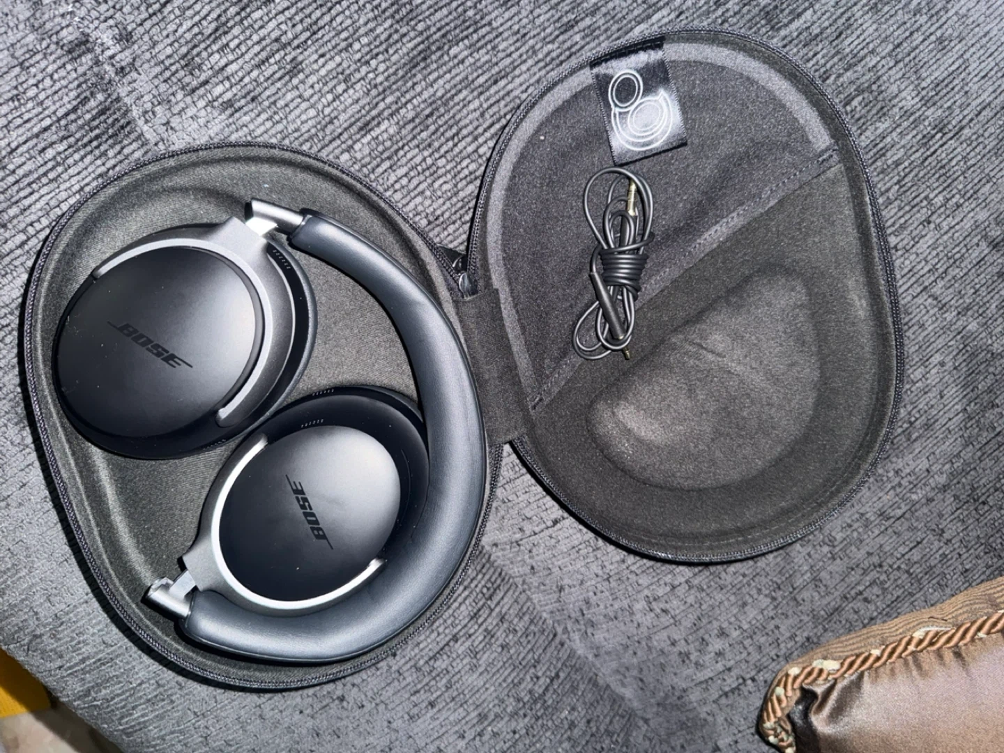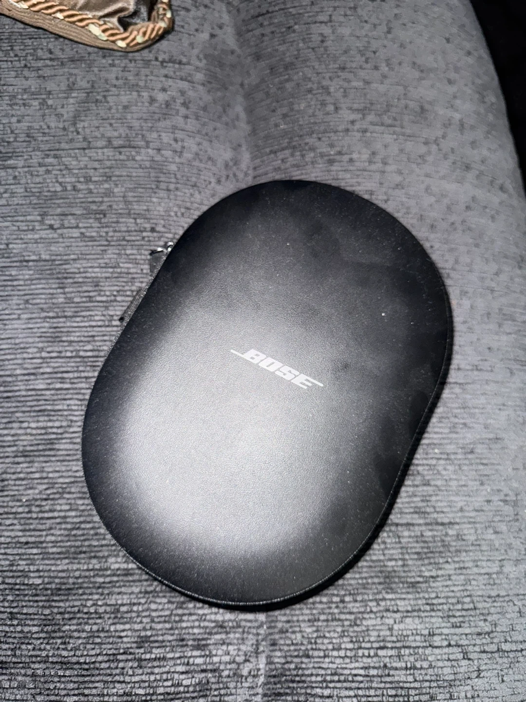 These are Bose wireless headphones, perfect for on-the-go listening. They come with a charging cable and a protective carrying case. Experience great sound quality and comfort!