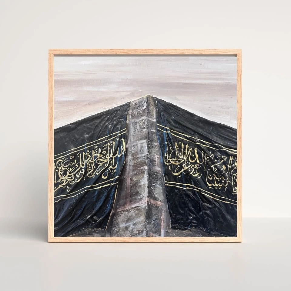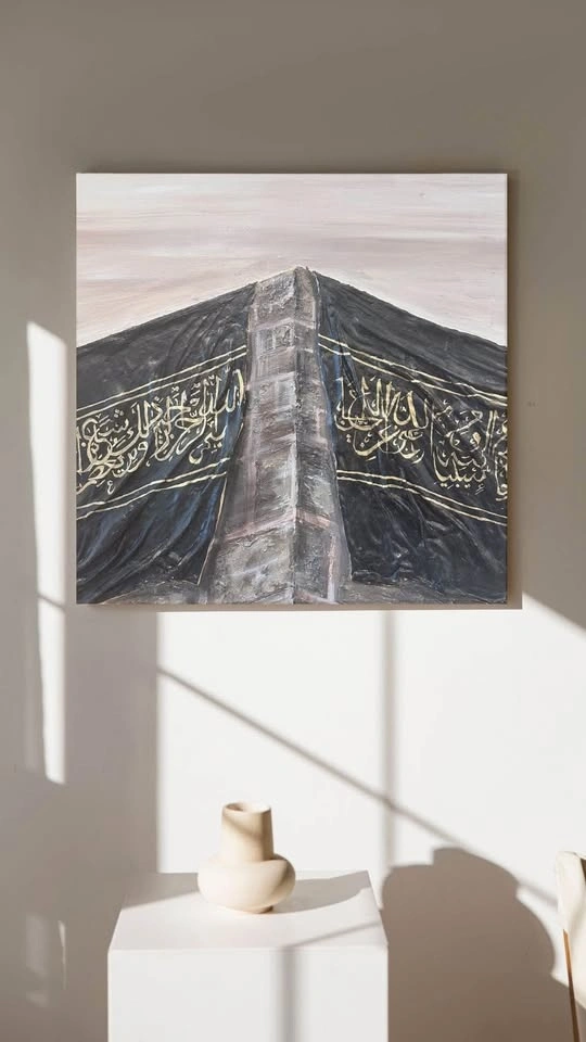 Original textured painting, 60x50cm. This piece beautifully captures the essence of the Kaaba with a black clay-textured fabric, adorned with Quranic verses in gold paint. A unique and spiritually enriching artwork, perfect for any space seeking a touch of serenity and faith.