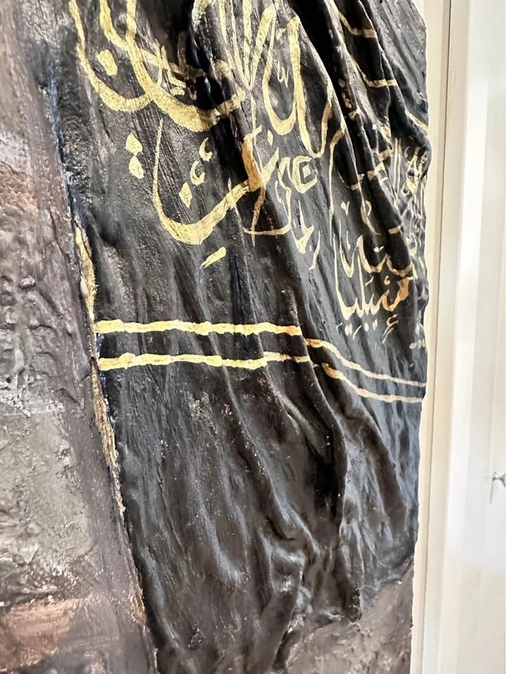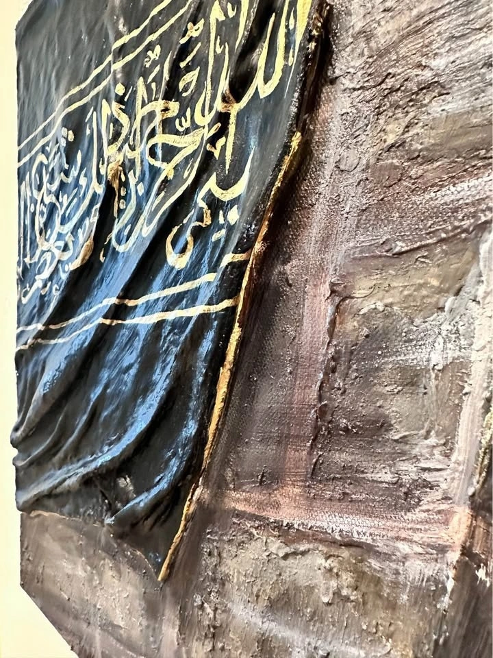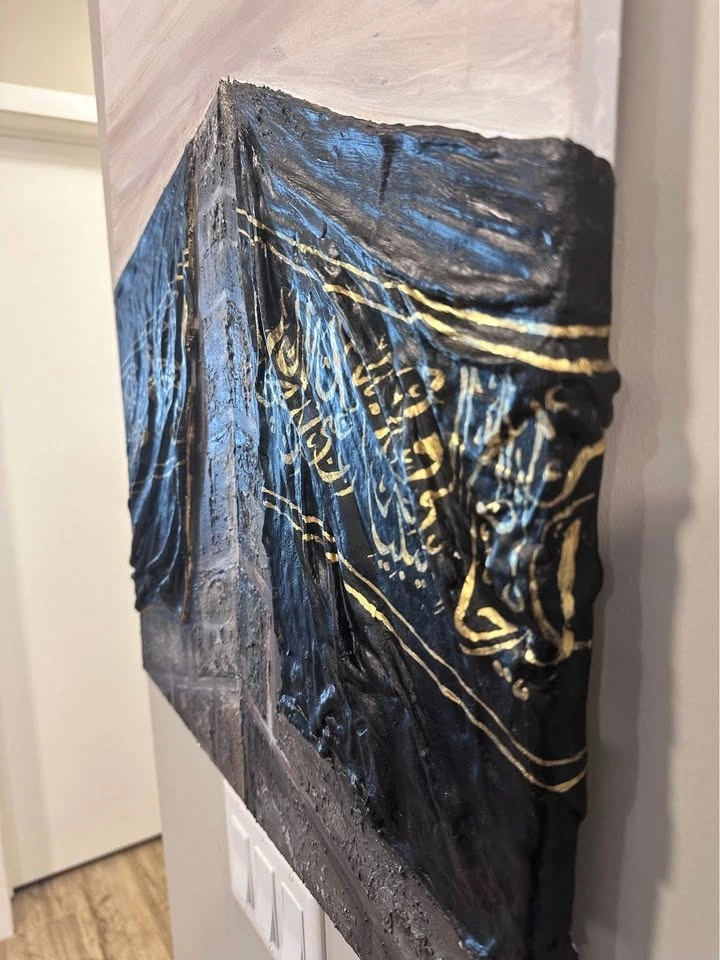 Original textured painting, 60x50cm. This piece beautifully captures the essence of the Kaaba with a black clay-textured fabric, adorned with Quranic verses in gold paint. A unique and spiritually enriching artwork, perfect for any space seeking a touch of serenity and faith.