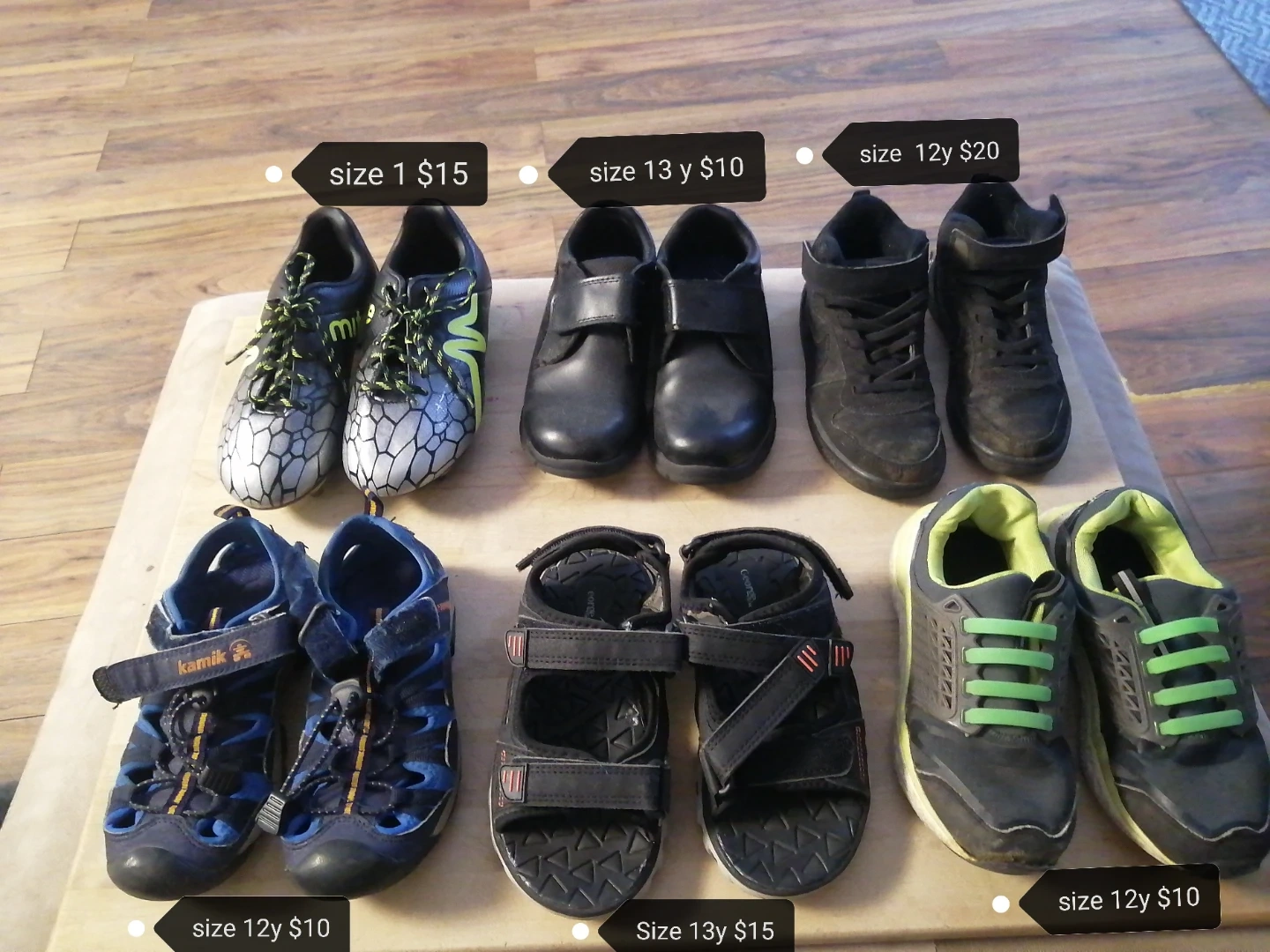 There are different styles and brands, including a pair of Kamik sandals in size 12y. Great for growing feet!