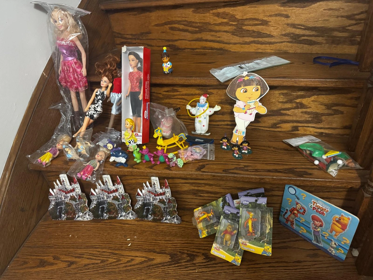 Large collection of various dolls and figurines. Includes Barbie, Disney characters, and more. Many are in plastic packaging. Great for collectors or kids.