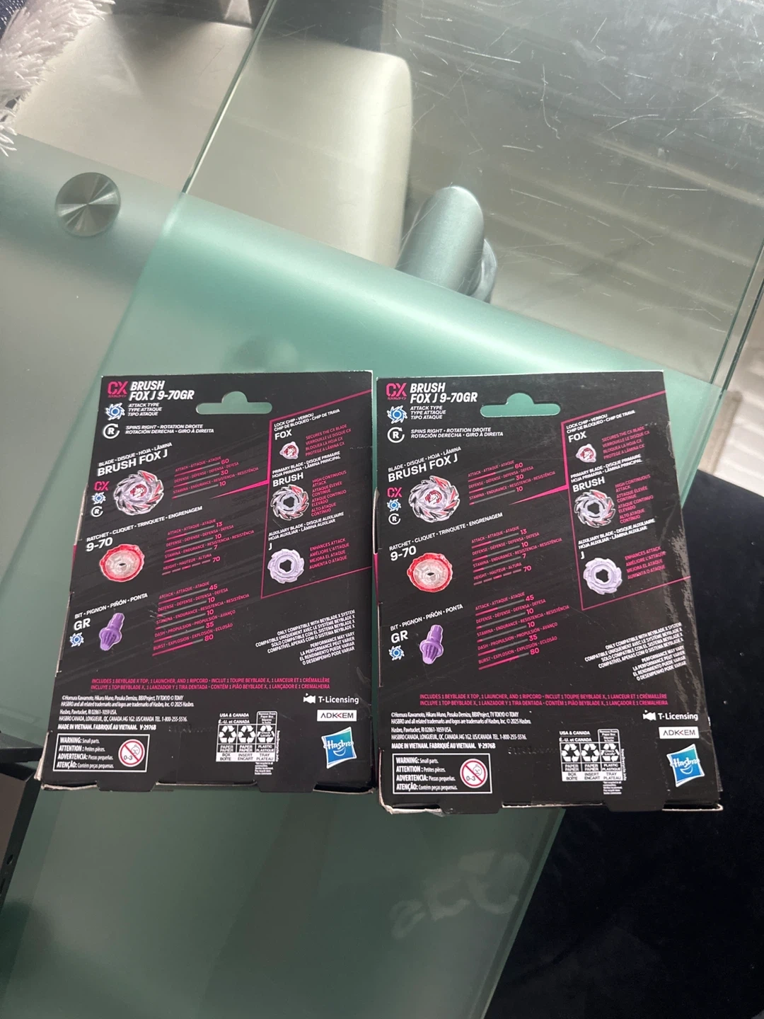 This is a 2-pack of Beyblade X BX-21 Brush Fox 9-70GR tops. Recommended for ages 8 and up. Includes Beyblade tops and launchers. Brand new never used no bargaining firm price