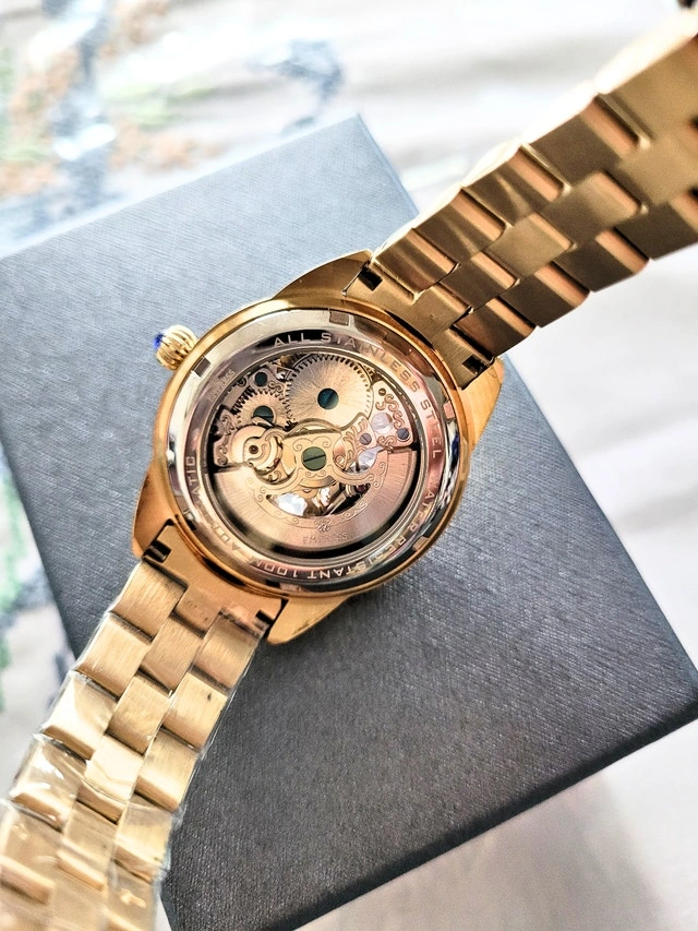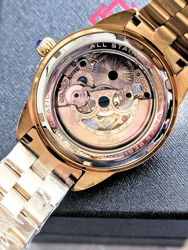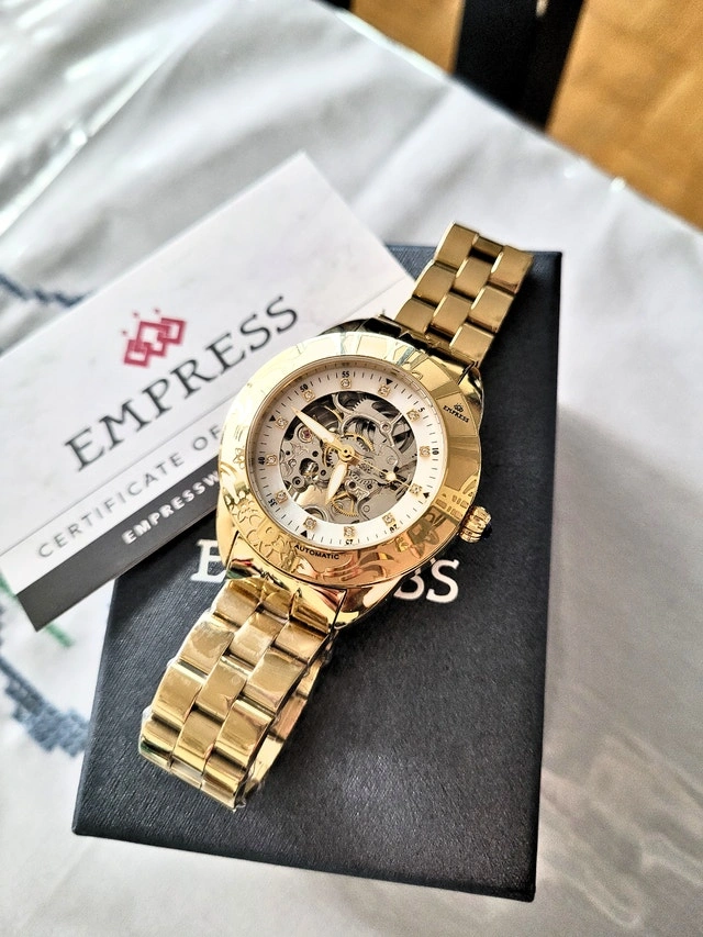 Brand new in the box with authenticity card. Retail value: $995. The silver model is also available. Features automatic movement with a 36-hour power reserve. Case size is 38mm with a 13mm thickness, made of 316L surgical-quality stainless steel with a sapphire crystal. Skeleton transparent exhibition case back and white MOP skeleton dial. Luminescent hands. Band color is gold. Water resistance 30M. Pick up near Sheppard & Don Mills.
