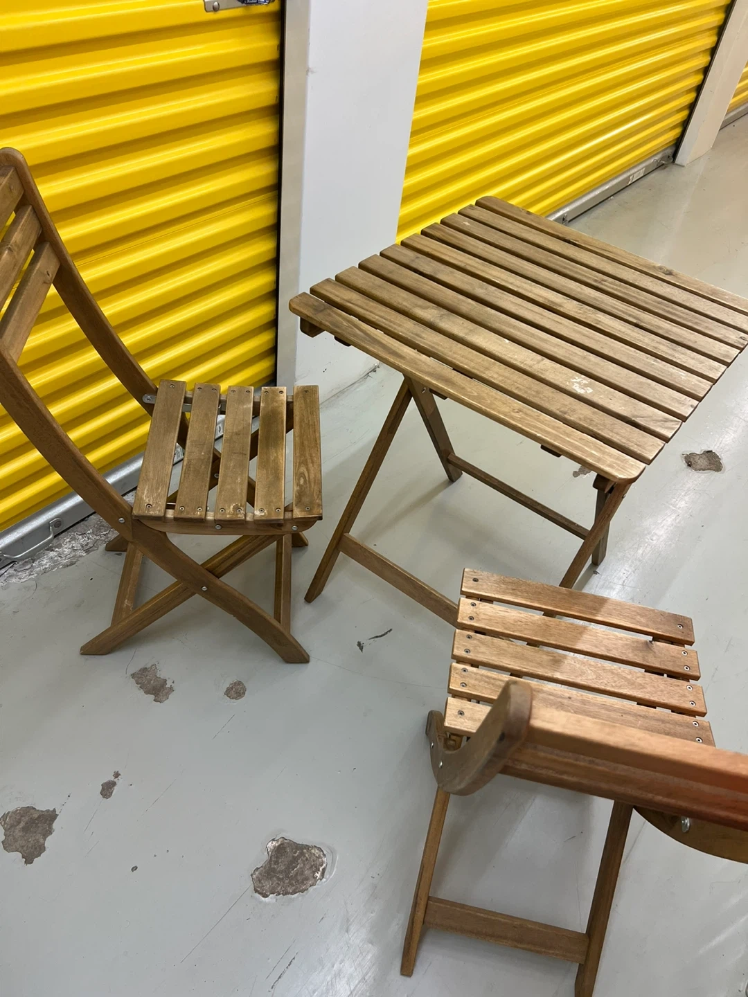 Selling a cute wooden folding table with two matching chairs. Perfect for a small balcony or patio! The set is in great condition and ready for a new home. Easy to fold and store when not in use, making it ideal for small spaces