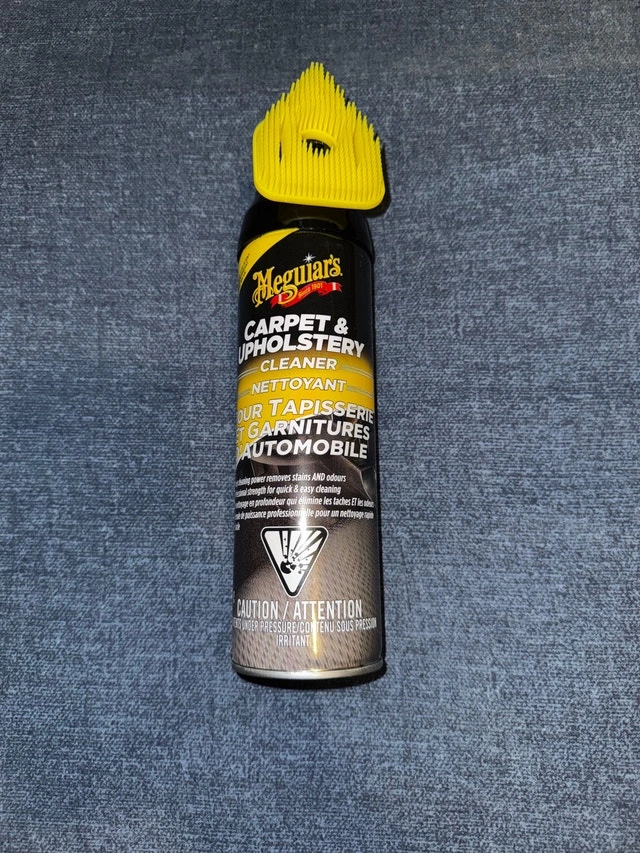 Selling a brand new can of Meguiar's Carpet & Upholstery Cleaner, perfect for automotive detailing and cleaning. This spray is designed to powerfully remove stains and odours, leaving your car's interior fresh and clean. It comes with a convenient scrub brush attachment.