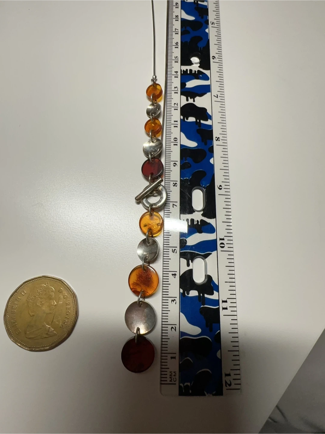 Features warm-toned amber chips in shades of honey, cognac, and deep cherry, paired with solid silver accents and a classic T-bar clasp.