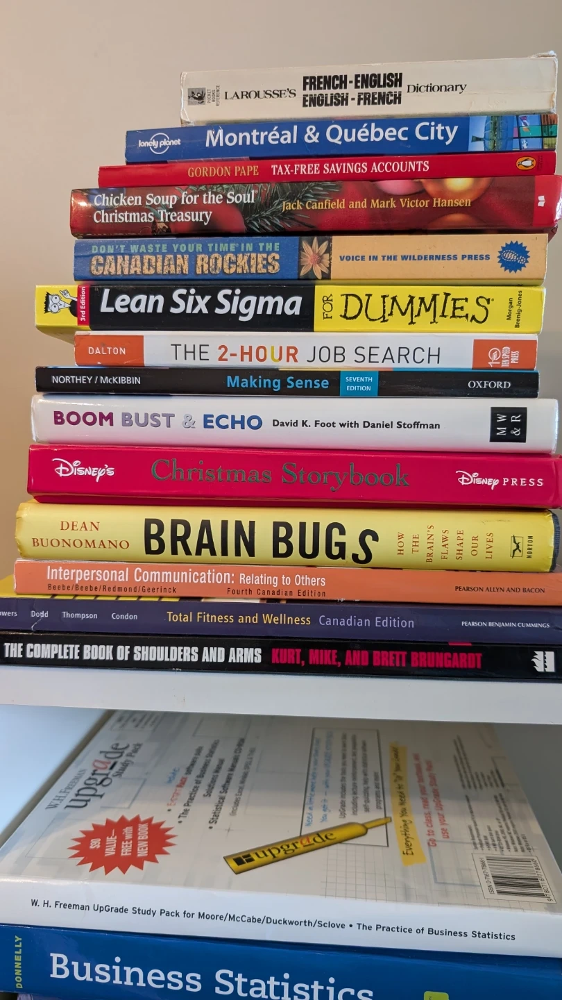 Collection of 13 used books covering diverse subjects like business, travel, and personal finance. Includes titles such as 'Lean Six Sigma for Dummies' and 'Montréal & Québec City'. Books are in readable condition for educational or leisure use.