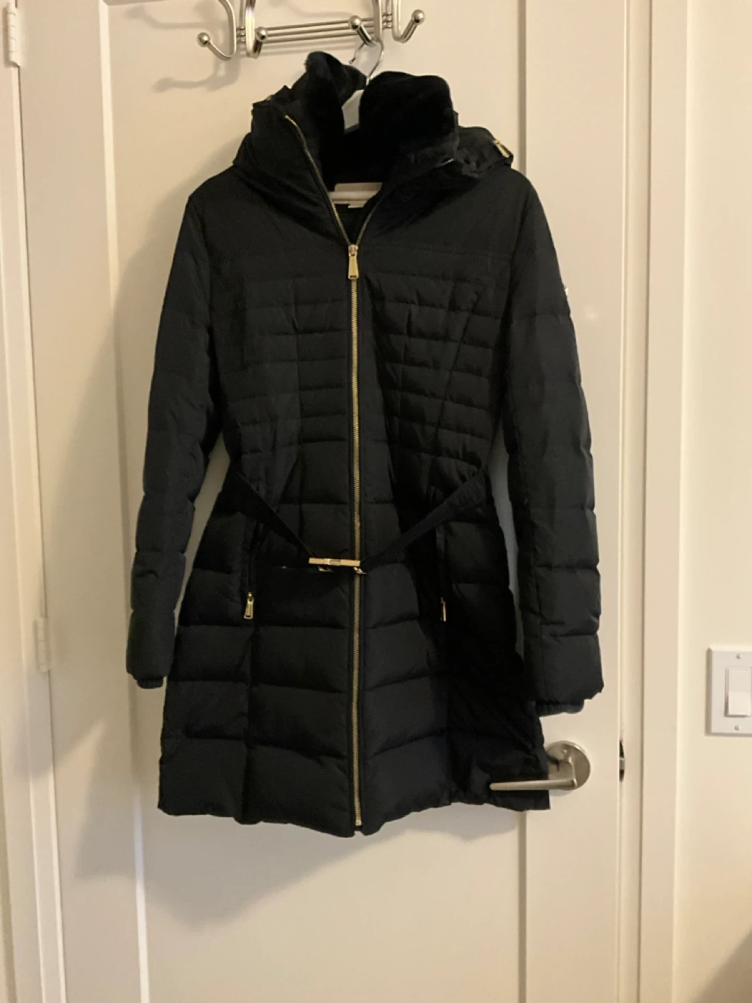 Black Michael Kors puffer coat with gold hardware and a belt. It's a stylish and warm winter jacket. It has a hood for extra protection.