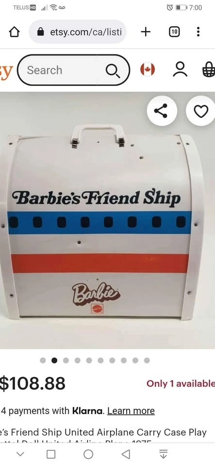 Buy & SellVintage Barbie plane toy🏆Vintage Barbie plane toy🏆$60Feel free to message if you have any questions!WHERE TO MEETCheck LocationView MapSELLERnickiWest Galt200 reviews1 chats·0 favorites·12 viewsSEND CHAT TO SELLERHi nicki! I’m interested in your listing.Hi nicki! I’m interested in your listing.Get the Karrot app to chatSign In to chat