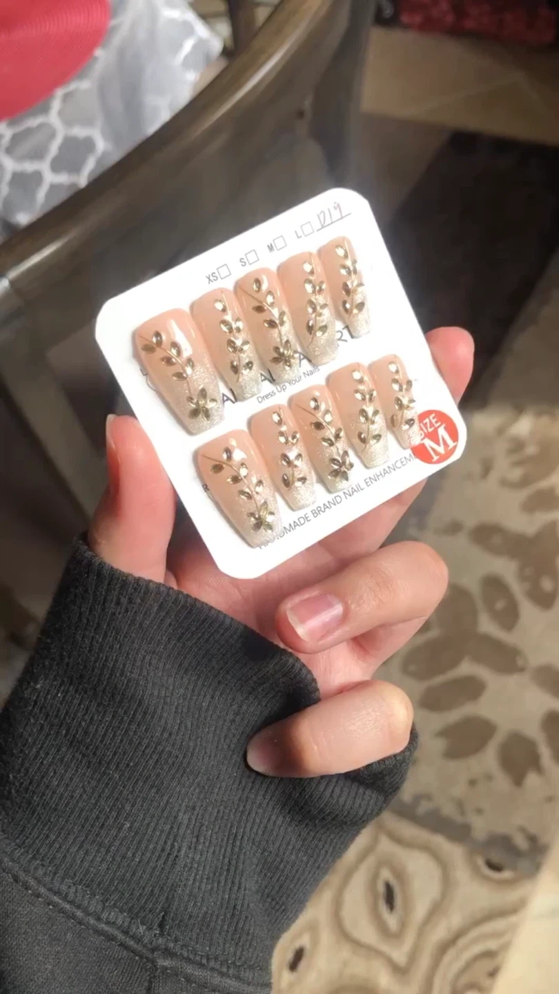 These are handmade brand nail enhancements. They're decorated with a gold leaf design. Size M is indicated on the packaging.